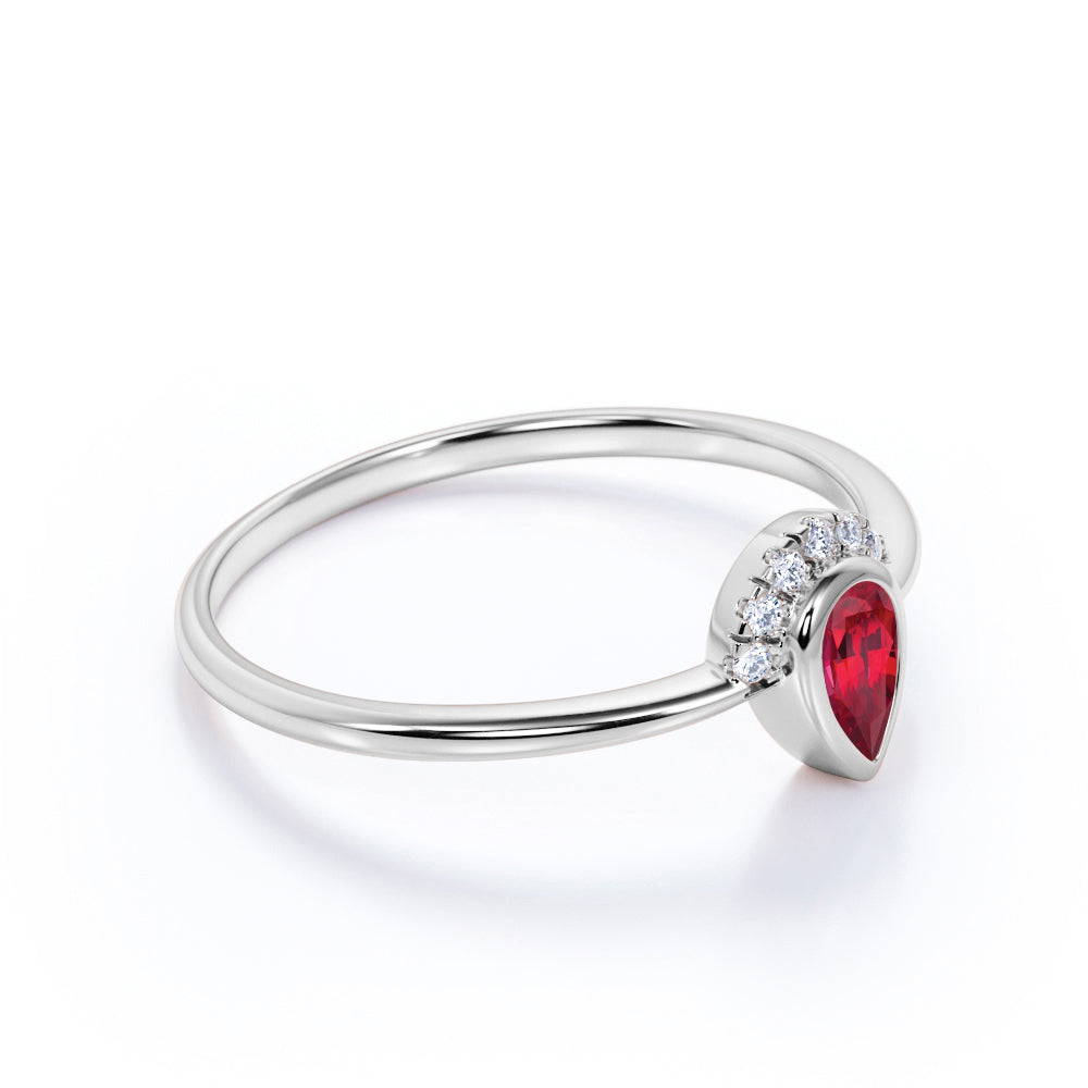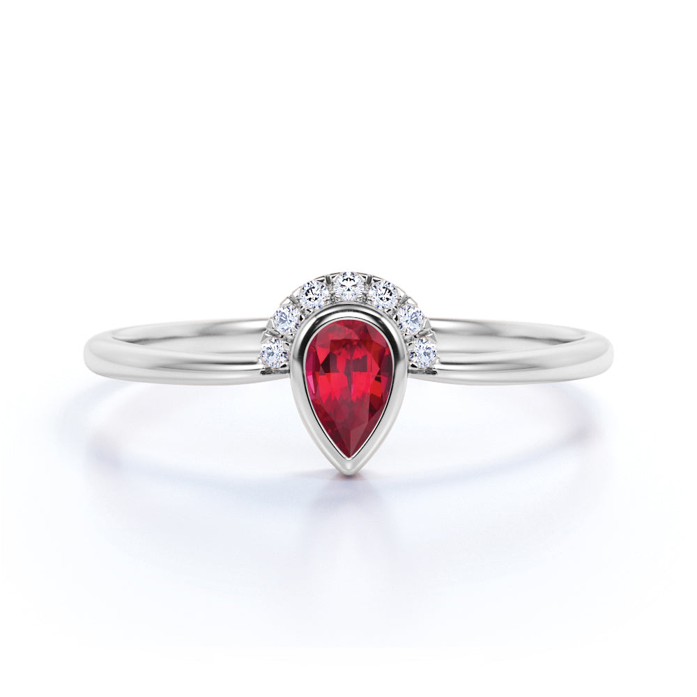 This Lab Ruby is best for engagement ring or proposal ring. The vibrant color of this ring brings life to the fullest. This Lab Ruby is very unique since we can customized this to your preferred style or cut. Either in cushion, square, princess, pear, teardrop, round brilliant, oval, marquise, heart, trilliant, trillion, emerald, radiant, asscher or any other cut that you wish to receive. This Lab Ruby ring features an approximately .75 carat pear shape Lab Ruby, surrounded by .25 carat side diamonds, for a total weight of 1 carats.