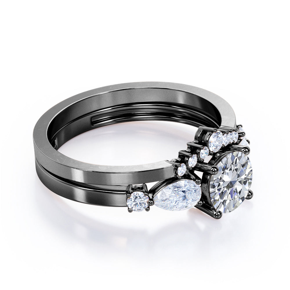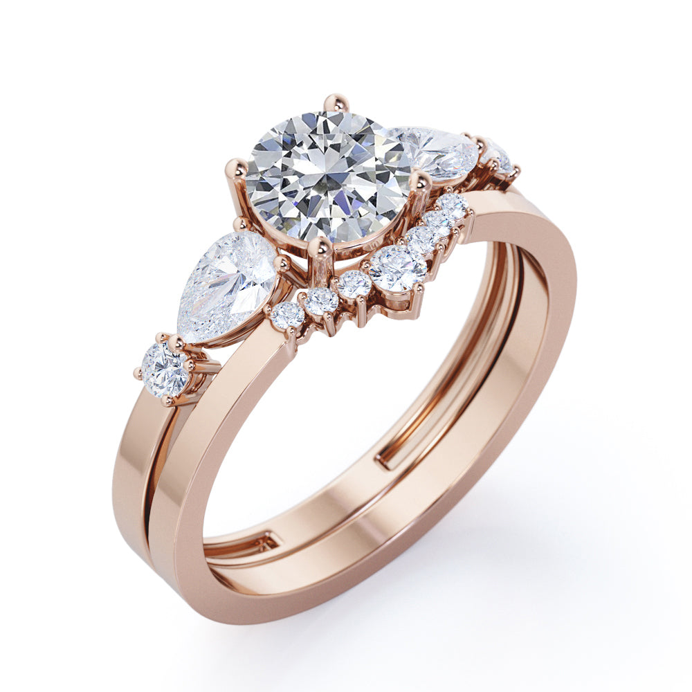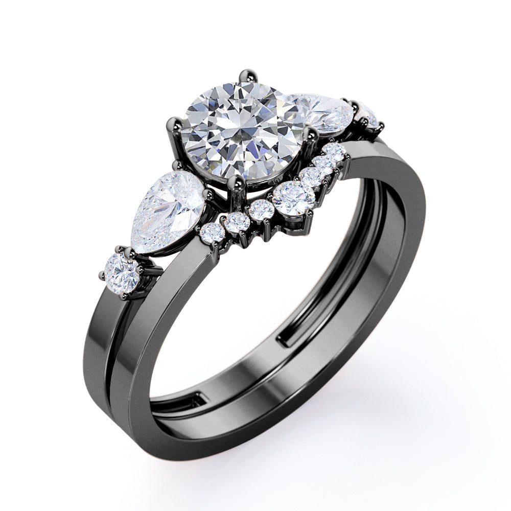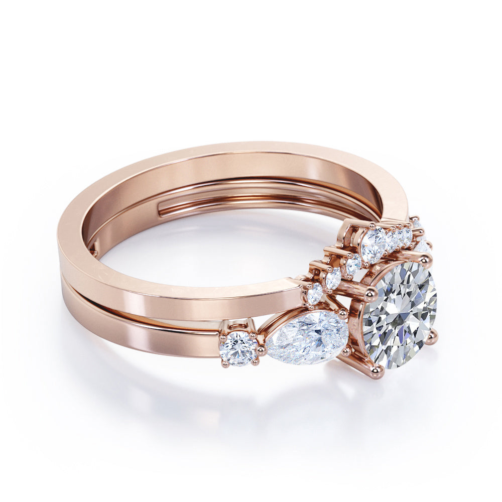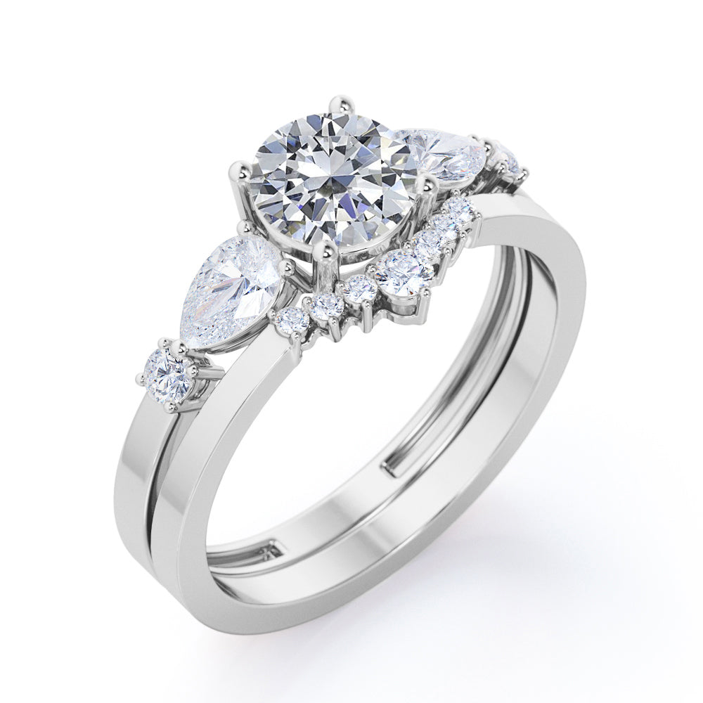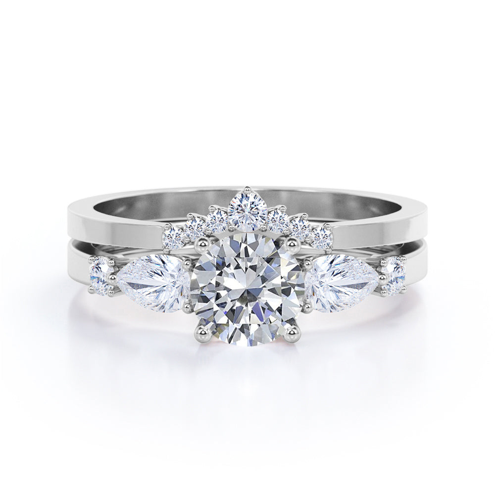 Delight the day with a Crown Princess 0.6 carat Round Moissanite and Diamond wedding Ring Set in White Gold. The engagement ring boasts a 0.5 carat round Moissanite that is connected to pear shape of Moissanite and followed by dainty round Moissanite. The wedding band that comes within is contoured and curved a long the promise ring; it has a little slope where it is decorated by round Moissanite. The bridal set can be made in 18k gold over silver, 10k gold, 14k gold with the color of white gold, rose gold, yellow gold and black gold.