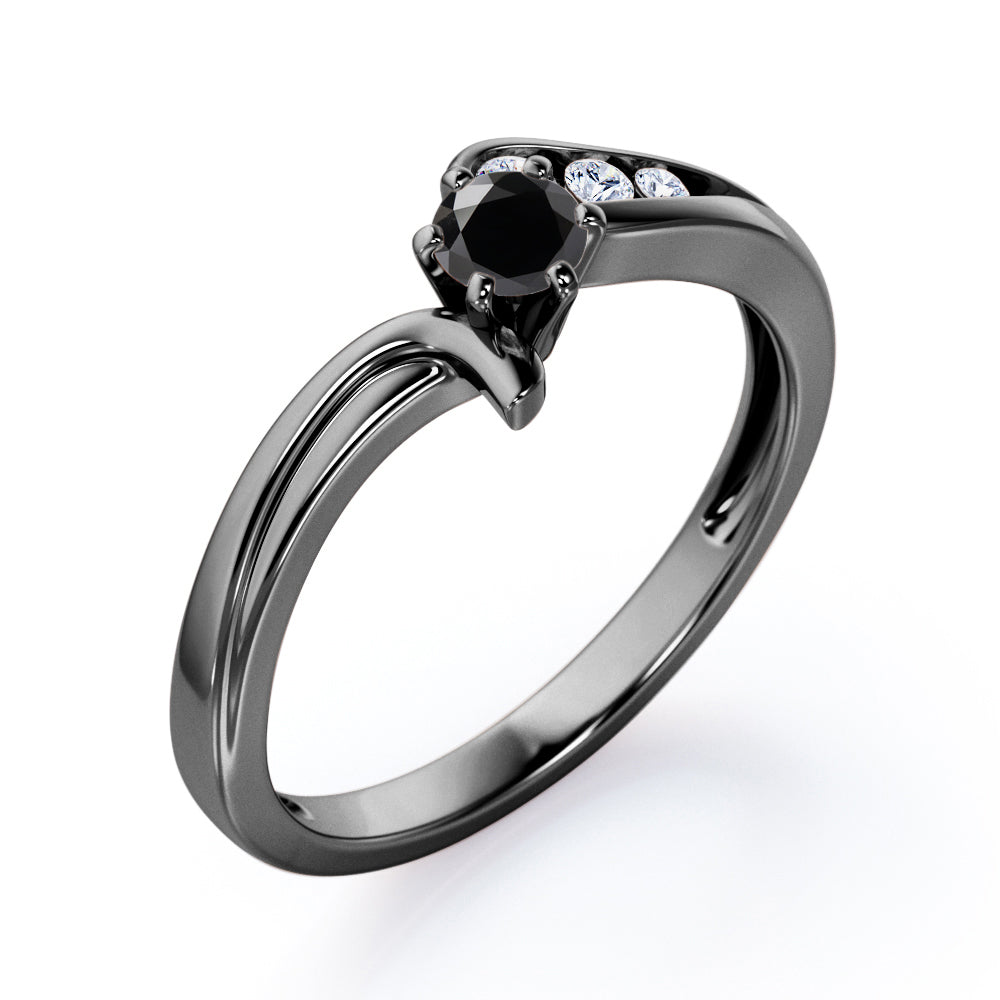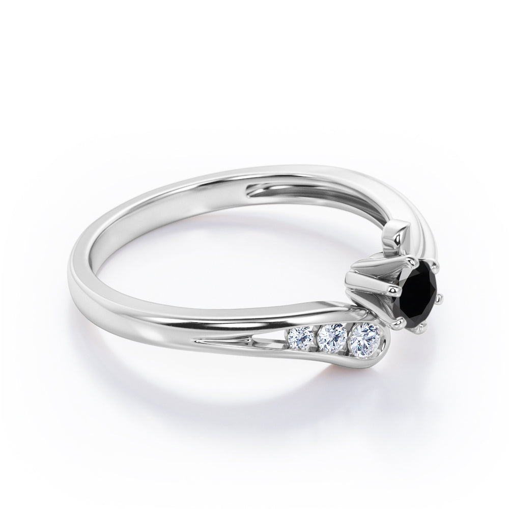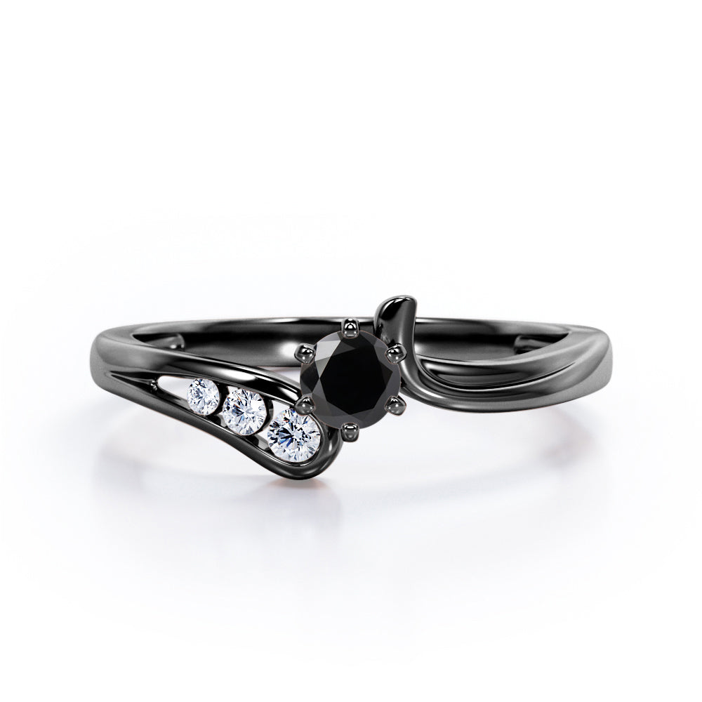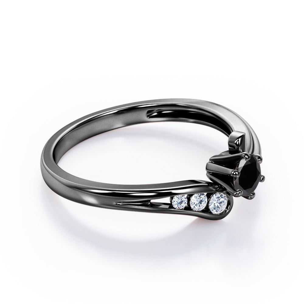 As lovely as it can be. A Curved Band - Six Prongs 0.5 carat Round Black diamond Artistic Engagement Ring in Rose Gold showcases a 0.5 carat round Black diamond in six prongs where curved shanks touch it perfectly. One side of the band is a plain sleek band that is bent like a cane while the other side, features a waterdrop shape that shelters three round Moissanite inside; with the biggest one connected with the center stone and followed by smaller ones. You can surely add this to your gift lift, either it's for your family, lover or even your favorite teacher, this ring will not disappoint them. This minimal jewelry can be made in either 18k gold over silver, 10k gold and 14k gold with the color of white gold, rose gold, yellow gold and black gold. Grab this affordable jewelry and surprise your special someone in any occasion.