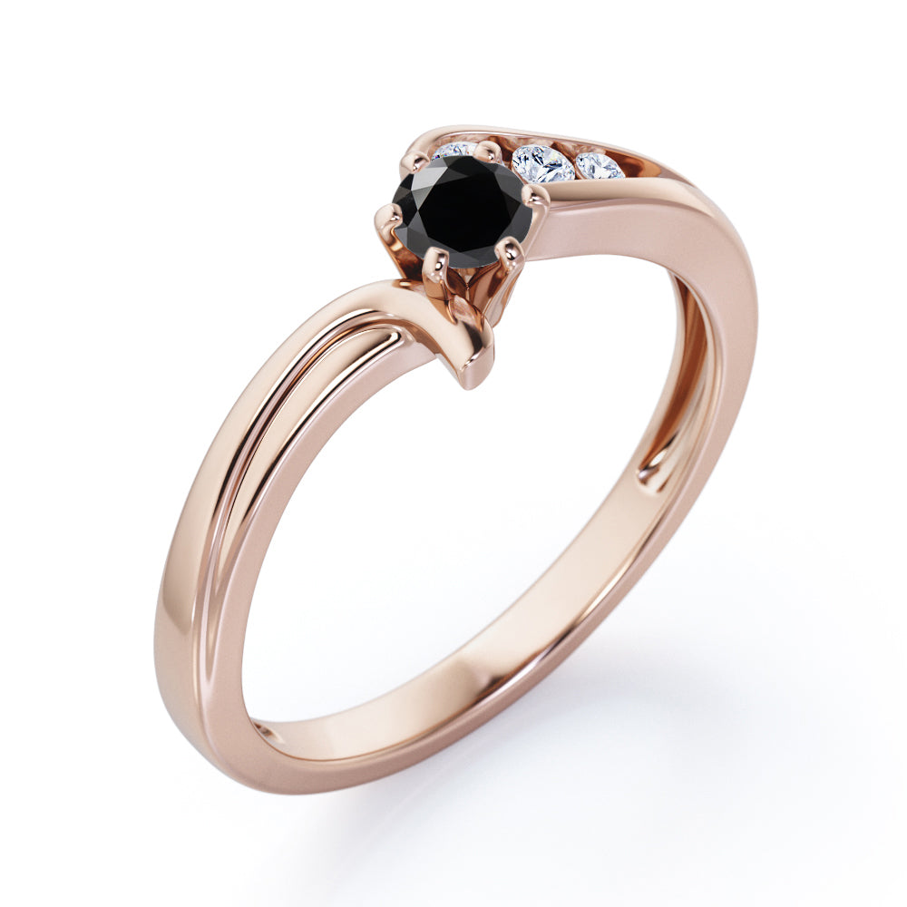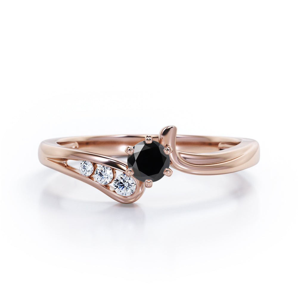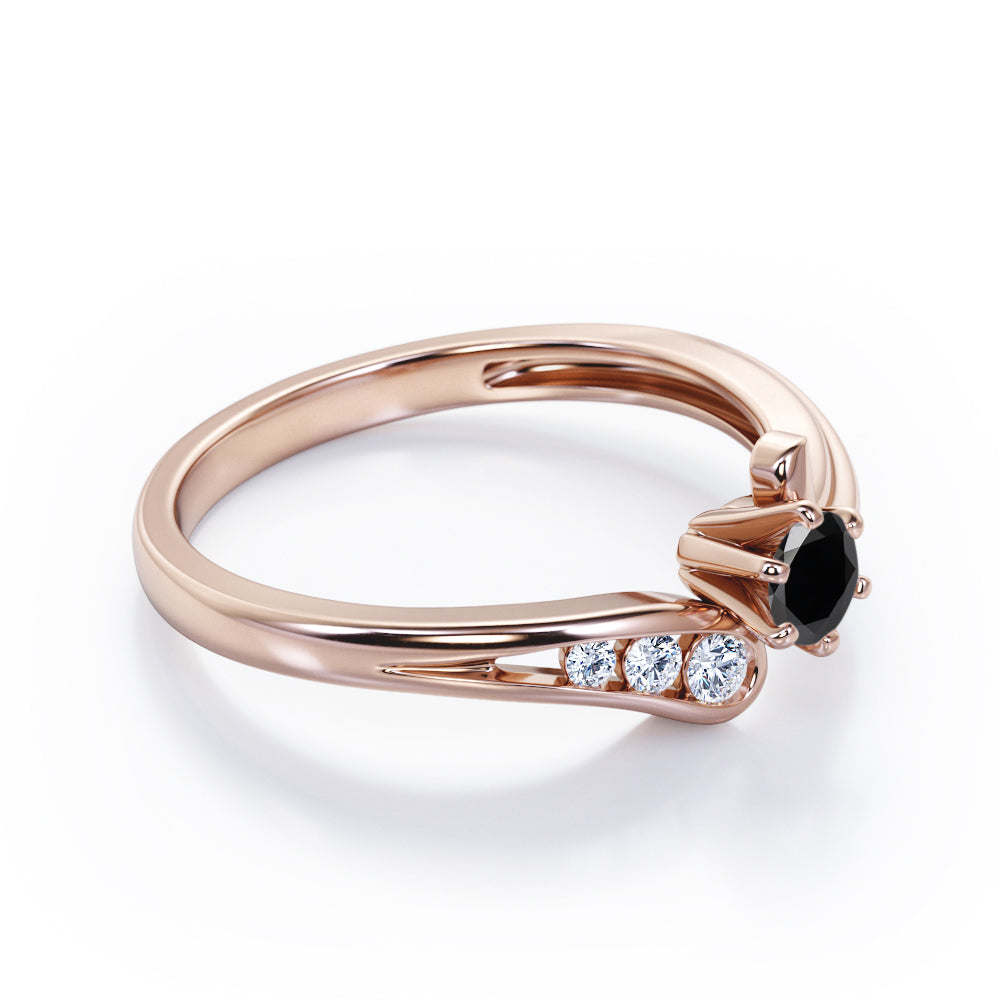 Curved Band - Six Prongs 0.5 carat Round Black Diamond Artistic Engagement Ring in Rose Gold