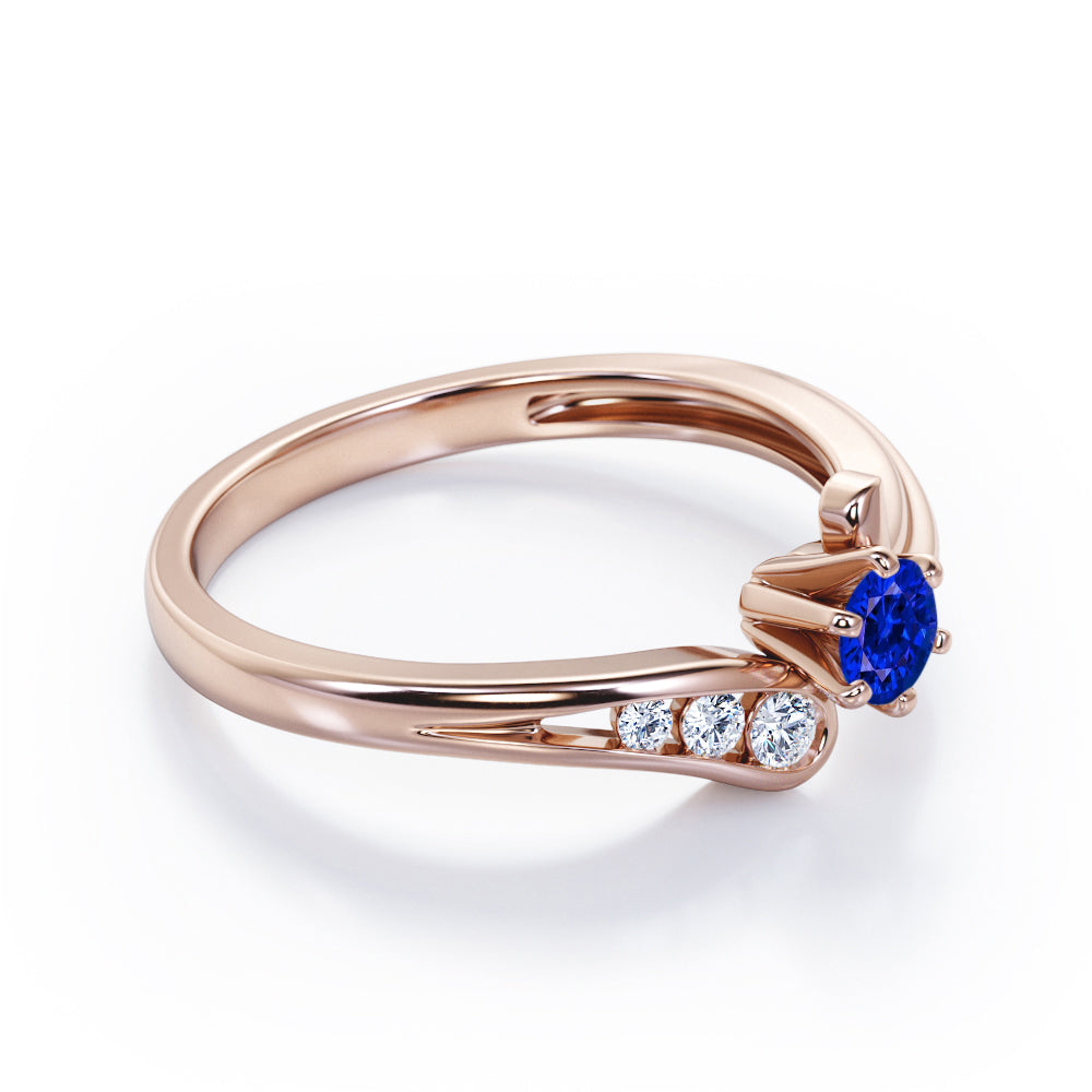 Curved Band - Six Prongs 0.5 carat Round Blue Sapphire and Moissanite Artistic Engagement Ring in Rose Gold