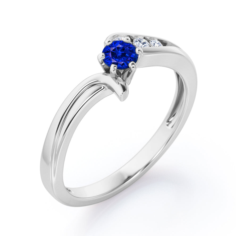 As lovely as it can be. A Curved Band - Six Prongs 0.5 carat Round Moissanite and Diamond Artistic Engagement Ring in Rose Gold showcases a 0.5 carat round Blue Sapphire in six prongs where curved shanks touch it perfectly. One side of the band is a plain sleek band that is bent like a cane while the other side, features a waterdrop shape that shelters three round Moissanite inside; with the biggest one connected with the center stone and followed by smaller ones. You can surely add this to your gift lift, either it's for your family, lover or even your favorite teacher, this ring will not disappoint them. This minimal jewelry can be made in either 18k gold over silver, 10k gold and 14k gold with the color of white gold, rose gold, yellow gold and black gold. Grab this affordable jewelry and surprise your special someone in any occasion.