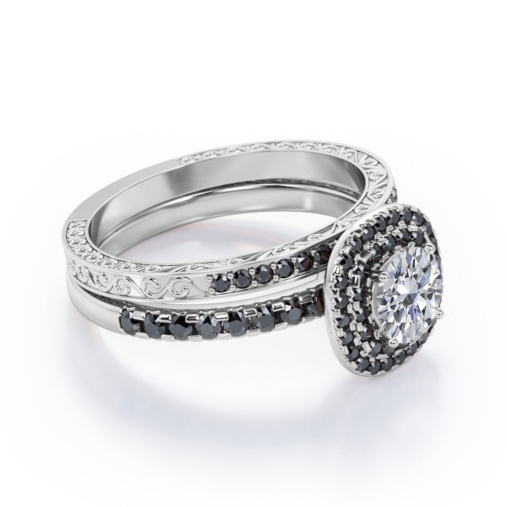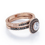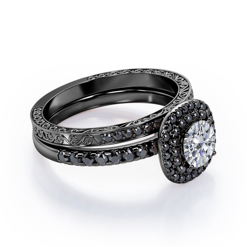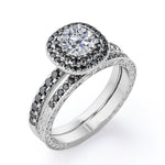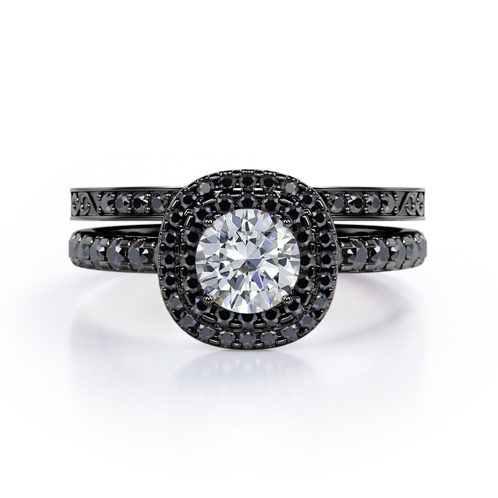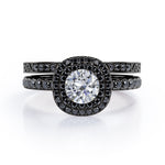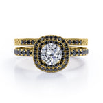 Adorn her finger with these Cushion Double Halo 1.75 TCW Round Brilliant Cut Moissanite with Lab Created Black diamond Bridal Set with Pave Accents in Black Gold. Hand-cut with deftness into a lovely shape round cut by our most talented jewelers, these astounding Moissanite wedding rings for women is made up of total 1.75 carat Moissanite with lab-created Black diamond side stones on solid white gold. For those looking for something a little out of the ordinary, these inexpensive engagement rings are ideal for those who wish to express their charisma and uniqueness. with its dazzling beauty, these Moissanite jewelry will bring joy and good energy to its wearer. Beautiful and affordable, these affordable Moissanite rings are a great choice for any woman's jewelry collection. Our Moissanite engagement rings for women, the birthstone bridal ring set for the fourth month, represents riches and extravagance and would make an excellent gift for friends or your better half. Also, these Moissanite wedding rings can be customized, so customers can choose one of metal colors between White gold, rose gold, yellow gold and black gold in 18k Gold over Silver, 10k and 14k gold metal options. Let's show her how much you care by giving her these wedding anniversary rings.