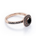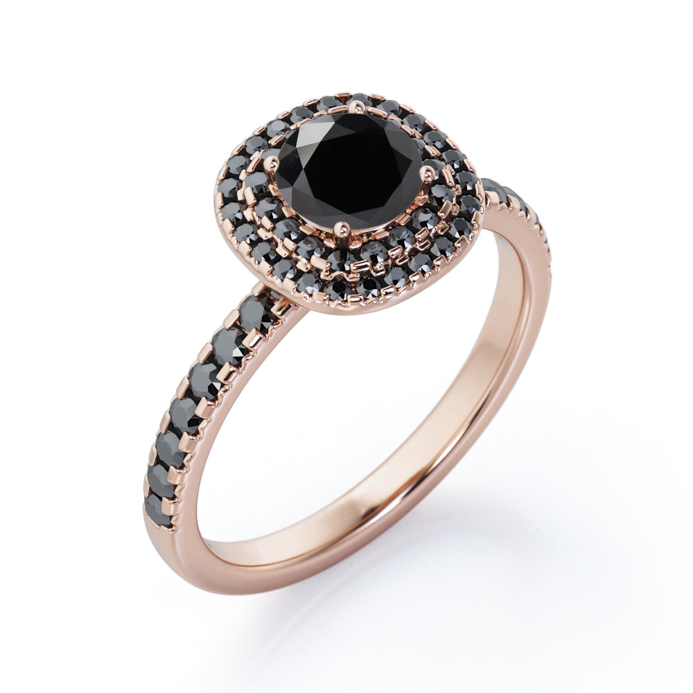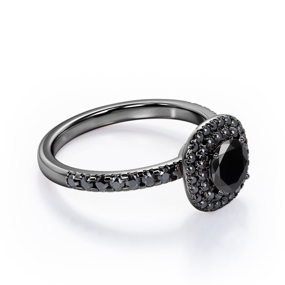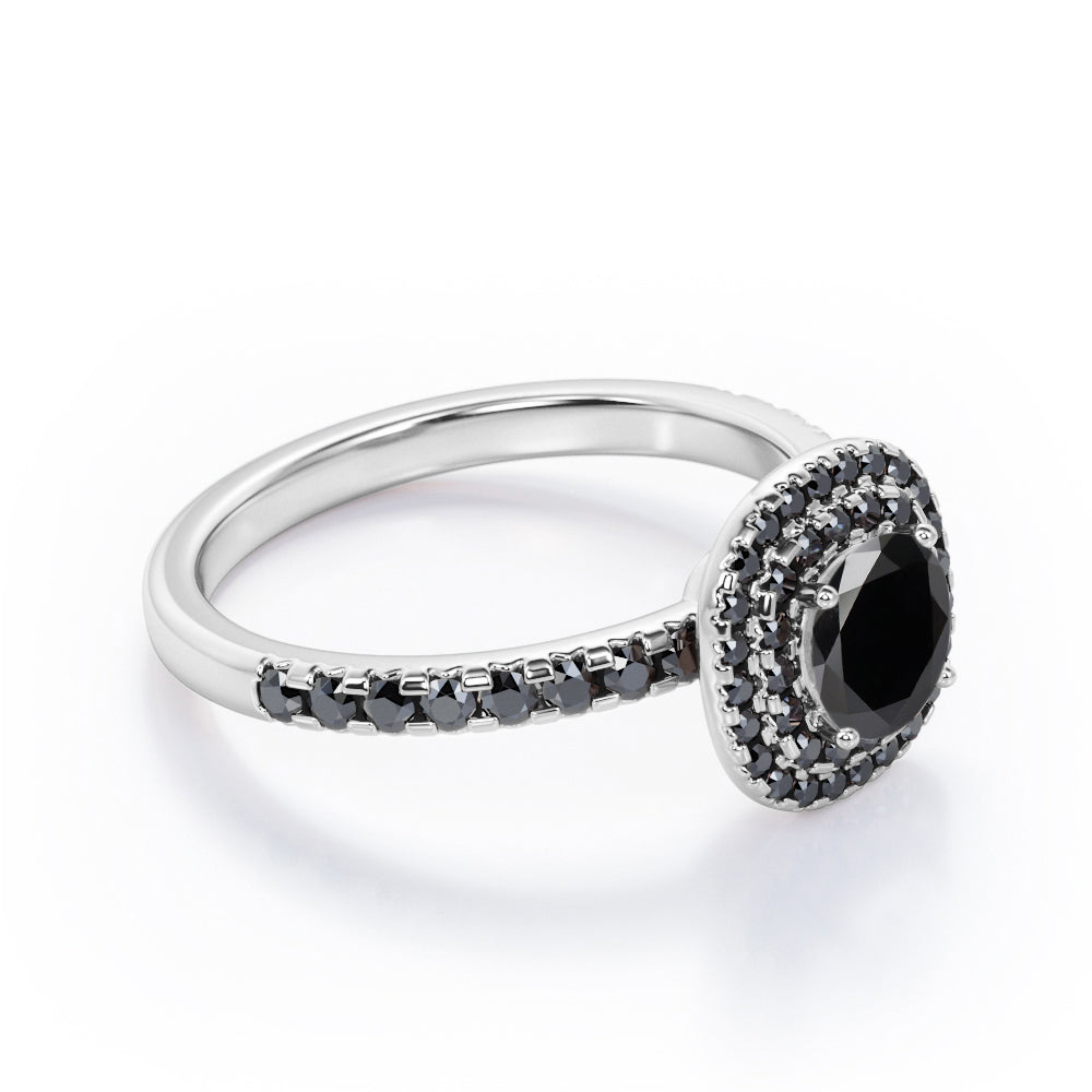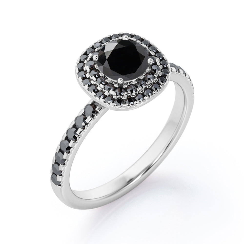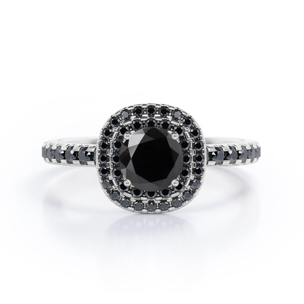 Be highly fashionable with this Cushion Double Halo - 1.5 TCW Round Cut Lab Created Black Diamond - Engagement Ring with Pave Accents in White Gold. Professionally handcrafted into a fine round cut by our experts in lapidary, this beautiful black diamond jewelry showcases total 1.5 carat lab created black diamond on solid white gold. Distinctive and extraordinary, this black diamond promise ring is well-suited for those who are not quite into normal lifestyle. Reflective properties of this black diamond band will absolutely enhance every style of its wearer. This black diamond ring is beautiful and accessible since it is available at an affordable price. For those who have no idea what to surprise your life partners, this black diamond ring can definitely help you out. Also, this synthetic black diamond ring can be customized to your own choice of metal colors: white gold, rose gold, yellow gold or black gold in 10k and 14k gold metal options. Let's fulfill your love story with this synthetic black diamond ring and, surely, she will not regret it.