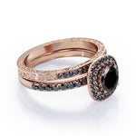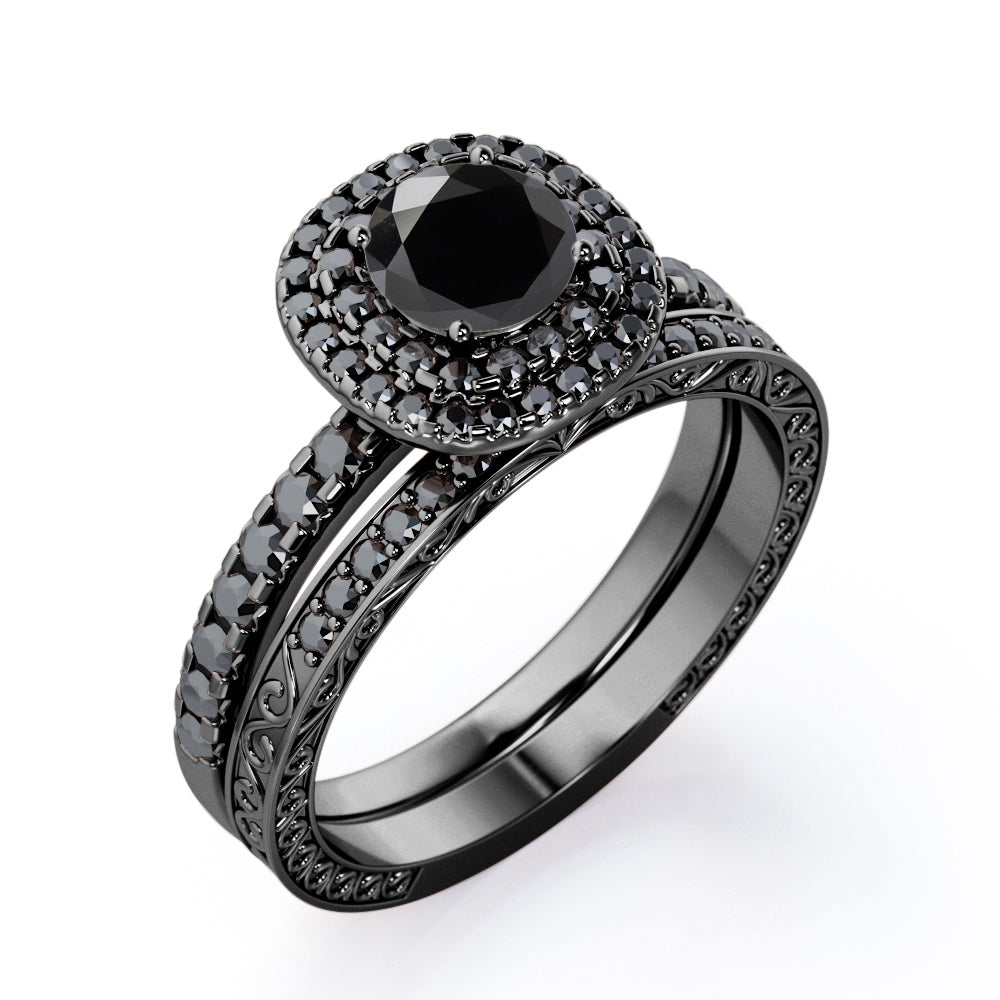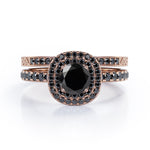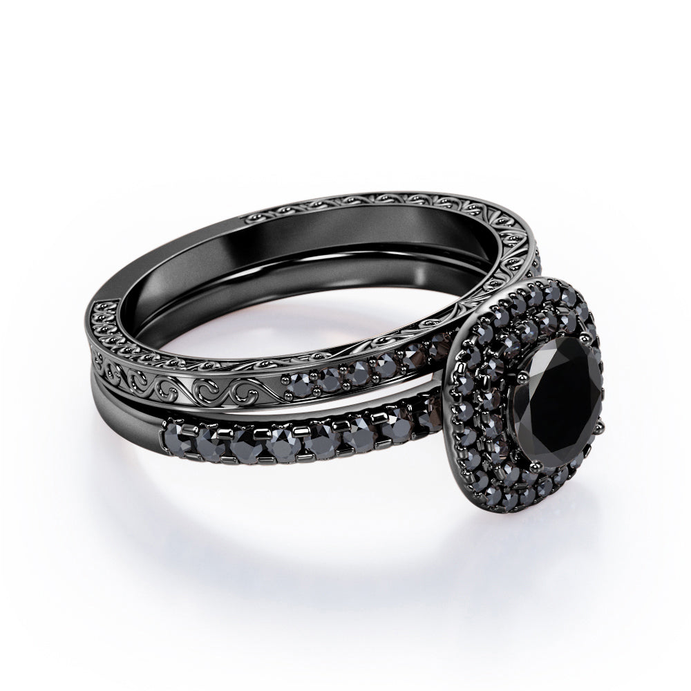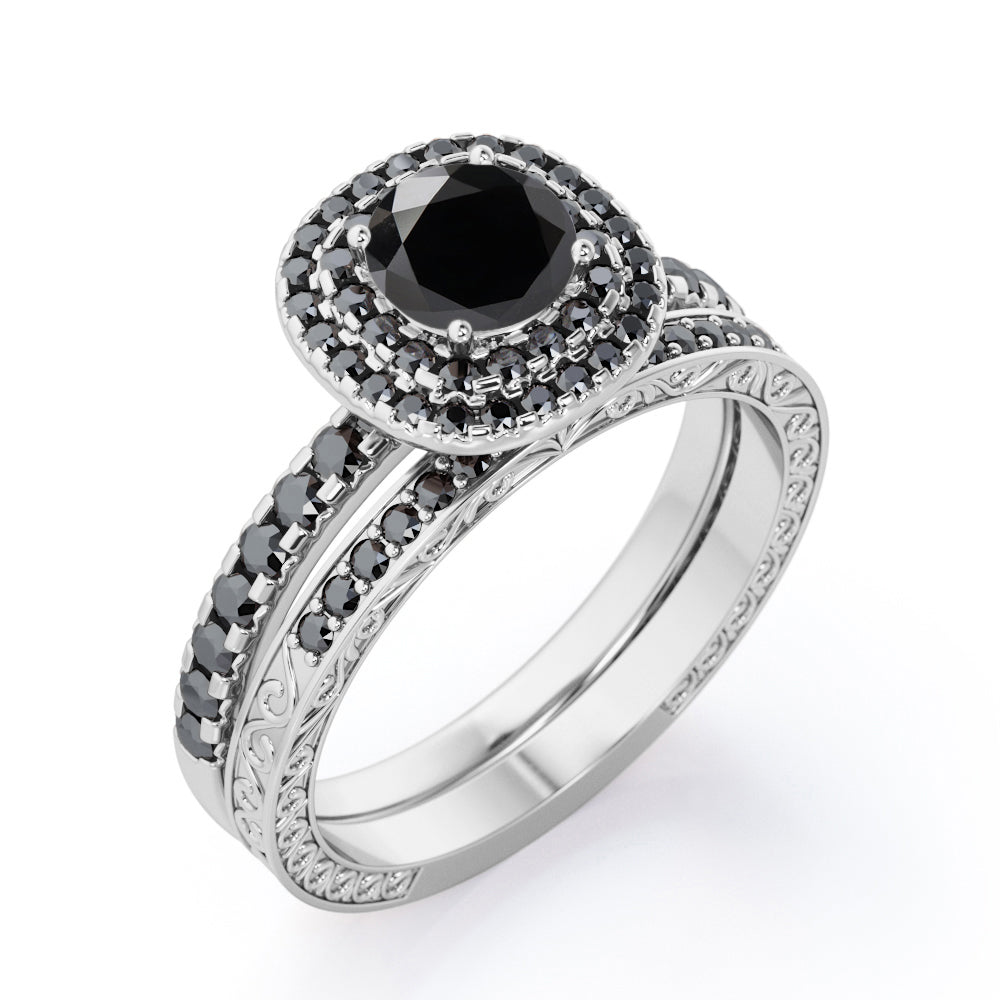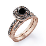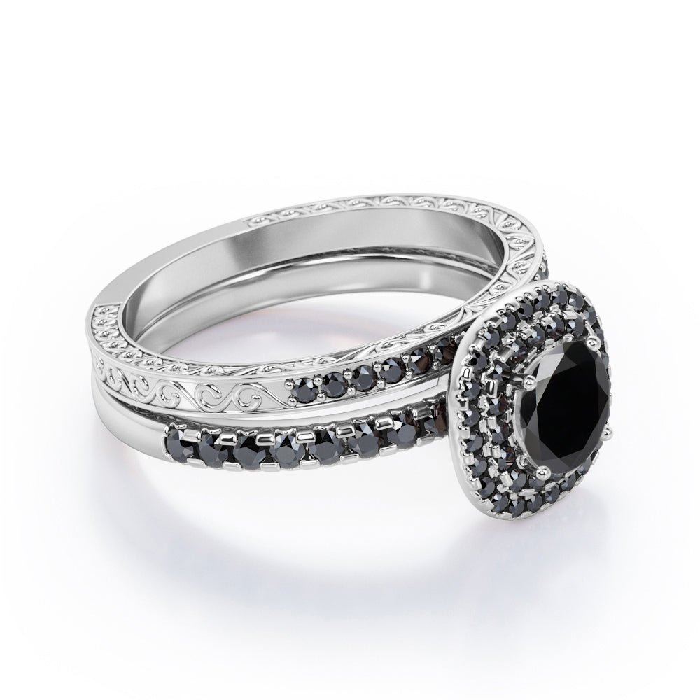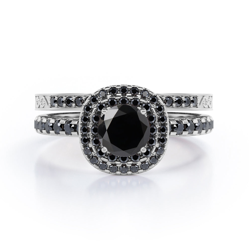 Make every day a cloud nine day with this Cushion Double Halo 1.75 TCW Round Brilliant Cut Lab Created Black Diamond Bridal Set with Pave Accents in White Gold. Professionally handcrafted into a fine round cut by our skilled jewelers, this splendid black diamond anniversary band set features total 1.75 carat lab created black diamond on solid white gold. Special and non-traditional, this black diamond ring set is perfect for those who would love to express their charisma and uniqueness. Reflective properties of this black diamond jewelry will enhance happiness and attract positive vibes. This black diamond jewelry is beautiful and accessible since it is available at an affordable price. Considered as a symbol of eternal love and affection for your lover, this black diamond engagement ring set can be a good choice for any special occasion, i.e. a birthday ring, an engagement or marriage proposal ring, a Valentines' day ring, etc. This black diamond anniversary band set can be customized, so customers can choose one of metal colors between white gold, rose gold, yellow gold or black gold in 10k and 14k gold metal options. Let’s impress her with this black diamond wedding band set and, surely, she will not regret it.