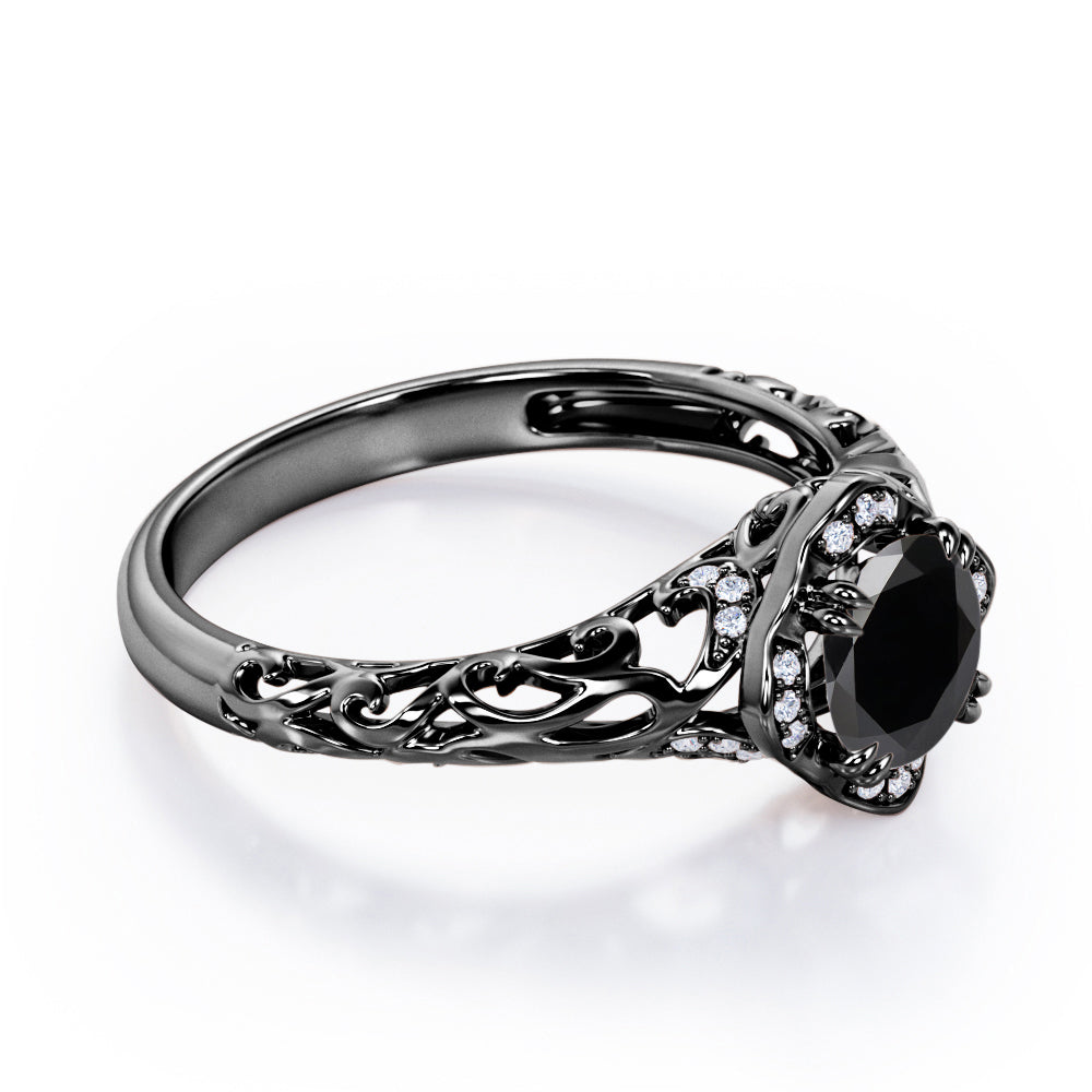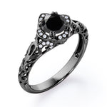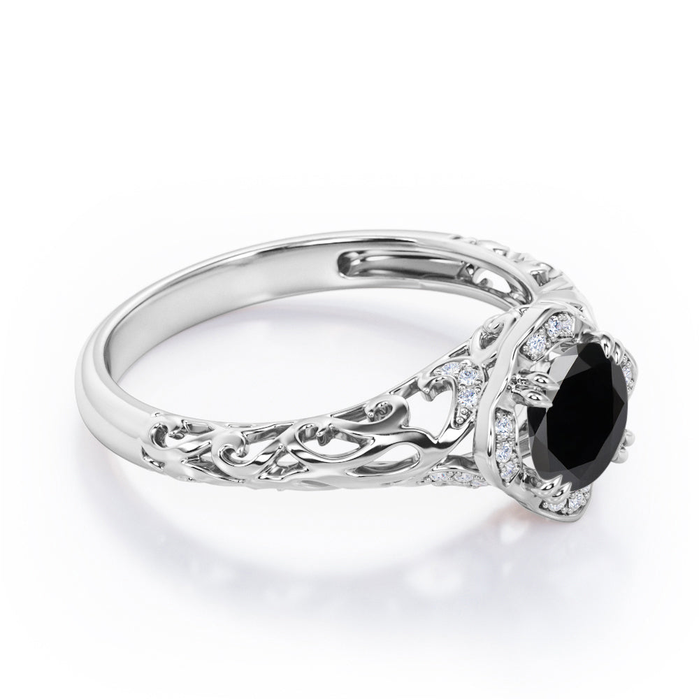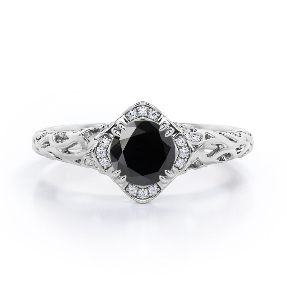 Cushion Framed 1.10 Carat Round Cut Black Diamond Halo Art Deco Engagement Ring In White Gold. A brilliant beginning to your romantic love story, there is no style more lovely, sophisticated and classic than this engagement ring. It comprises of a brilliant round cut black diamond which shines at the center of the style, while additional white diamonds sparkle on the ring's shank for extra shimmer. An impressive and sparkling halo surrounds the round cut center black diamond for a ring that will definitely stand out. This cushion framed engagement ring features 1 carat center black diamond stone and 0.10 carat of side white diamonds for the glam. Handmade with sincere love and attention, this cushion framed 1.10 carat round cut black diamond halo art deco engagement ring in white gold can also be customised to 10k Gold or 14k Gold or as per your preference. She is going to love this for sure. Press the add to cart button now to make it all yours.