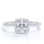 Make every day a cloud nine day with this Cushion Halo Design 1.75 Carat Round Cut Moissanite Pave Prong Set Engagement Ring In 18K White Gold Plating Over Silver. Skillfully hand-cut into a nice round cut by our skilled jewelers, this affordable best moissanite ring combines 1 carat moissanite and 0.25 carat side-stone moissanites on solid white gold plating over silver. Special and non-traditional, this moissanite stone ring is perfect for those who would love to express their charisma and uniqueness. With its glory and clarity, this white moissanite engagement ring will absolutely enhance every style of its wearer. This moissanite jewellery is beautiful and accessible since it is available at an affordable price. For those who have no idea what to surprise your life partners, this moissanite jewellery can be a perfect gift for any occasion like engagements, Valentine's day, mother's day or anniversary. If you are looking for some romantic gifts for your better half, this silver moissanite ring can definitely be the best option. Let's fulfill your love story with this near colorless moissanite ring and, surely, she will not regret it.