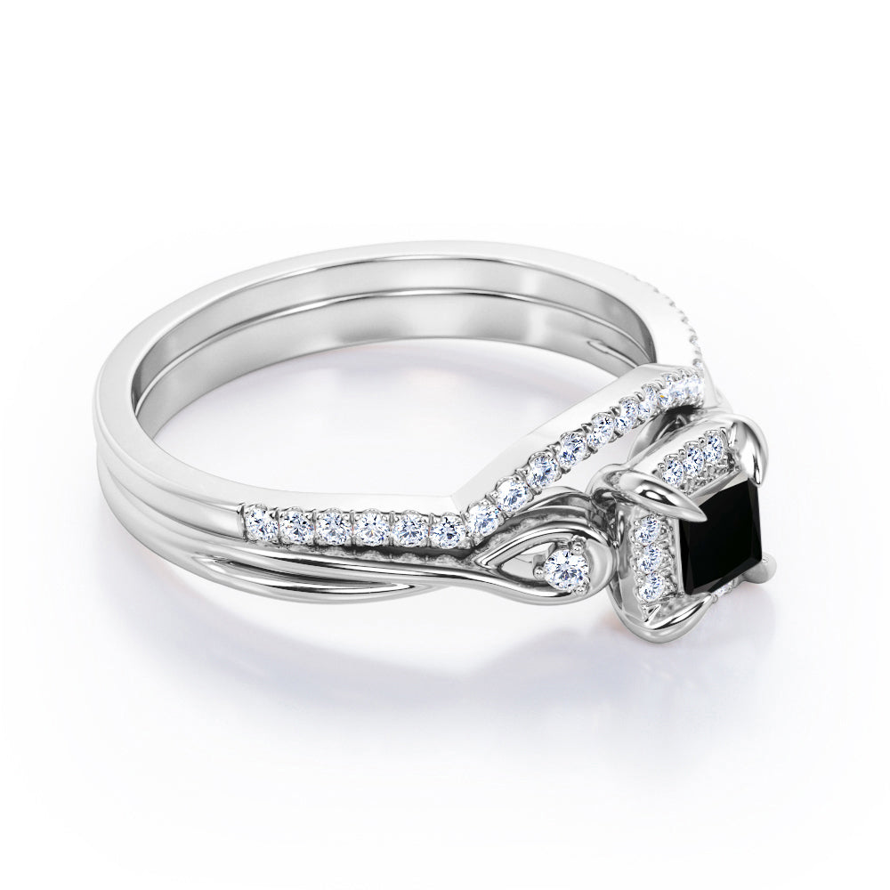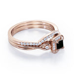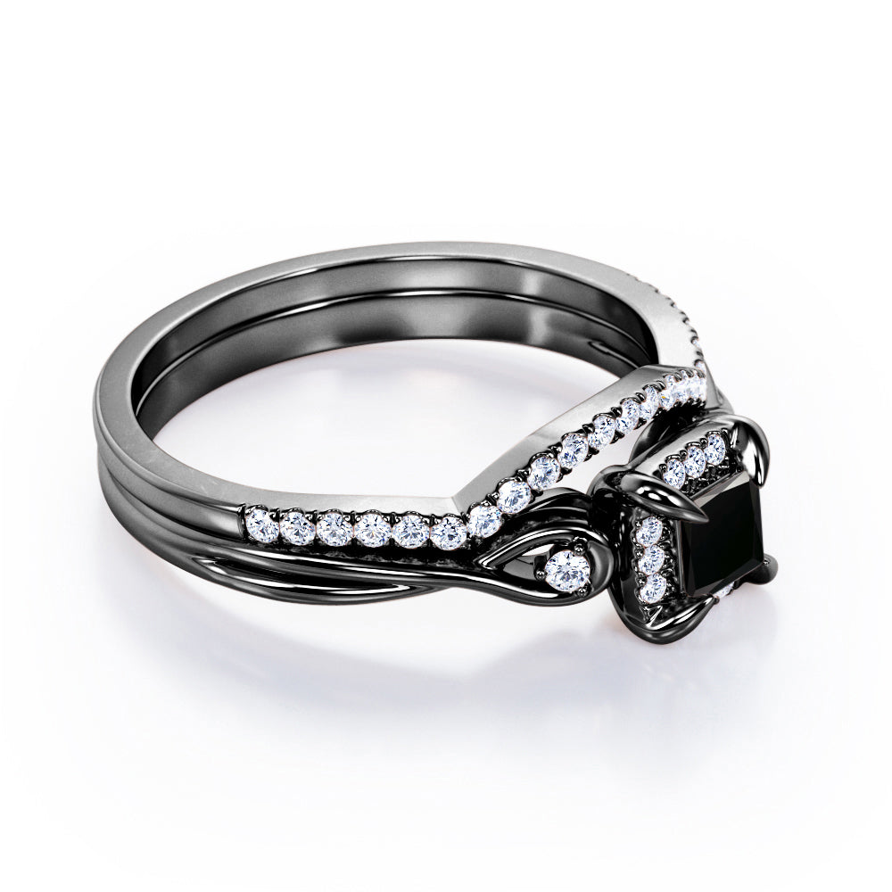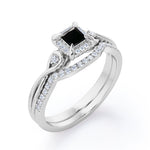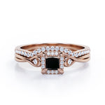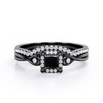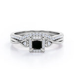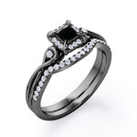 Make your moment more memorable with this Cushion Halo Prong - 0.69 TCW Princess Cut Black diamond - Infinity Split Shank Wedding Ring Set - Black Gold. The engagement ring features a 0.33 carat princess Black diamond which is placed in four massive prongs and surrounded by paved round dainty Moissanite. The band is twisted and made into an infinity sign, symbolizing an eternal love that you have for her. Each side of the band houses a dainty round Moissanite which adds more sparkle to the band. Comes with the promise ring is a curved wedding band; it is made into an arch shape and garnished by paved round Moissanite by half of the band. This bridal ring set can be made into 18k gold over silver, 10k gold and 14k gold with the color of white gold, rose gold, yellow gold and black gold.