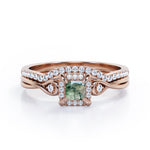 Make your moment more memorable with this Cushion Halo Prong - 0.85 TCW Princess Cut Moissanite and Diamond - Infinity Split Shank Wedding Ring Set - Rose Gold. The engagement ring features a 0.5 carat princess Green Moss Agate which is placed in four massive prongs and surrounded by paved round dainty Moissanite. The band is twisted and made into an infinity sign, symbolizing an eternal love that you have for her. Each side of the band houses a dainty round Moissanite which adds more sparkle to the band. Comes with the promise ring is a curved wedding band; it is made into an arch shape and garnished by paved round Moissanite by half of the band. This bridal ring set can be made into 18k gold over silver, 10k gold and 14k gold with the color of white gold, rose gold, yellow gold and black gold.