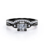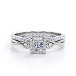 Make your moment more memorable with this Cushion Halo Prong - 0.65 TCW Princess Cut Moissanite and Diamond - Infinity Split Shank Wedding Ring Set - White Gold. The engagement ring features a 0.33 carat princess Moissanite which is placed in four massive prongs and surrounded by paved round dainty Moissanite. The band is twisted and made into an infinity sign, symbolizing an eternal love that you have for her. Each side of the band houses a dainty round Moissanite which adds more sparkle to the band. Comes with the promise ring is a curved wedding band; it is made into an arch shape and garnished by paved round Moissanite by half of the band. This bridal ring set can be made into 18k gold over silver, 10k gold and 14k gold with the color of white gold, rose gold, yellow gold and black gold.