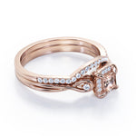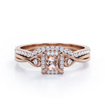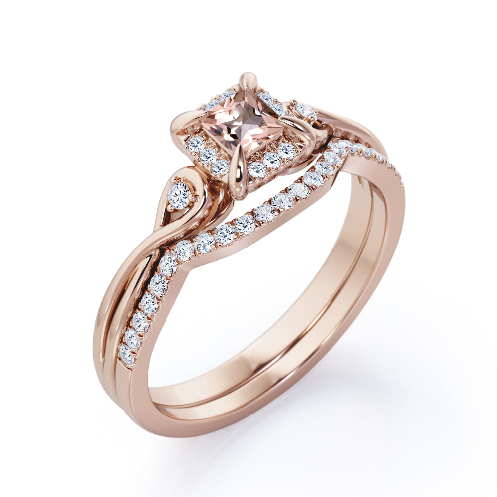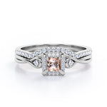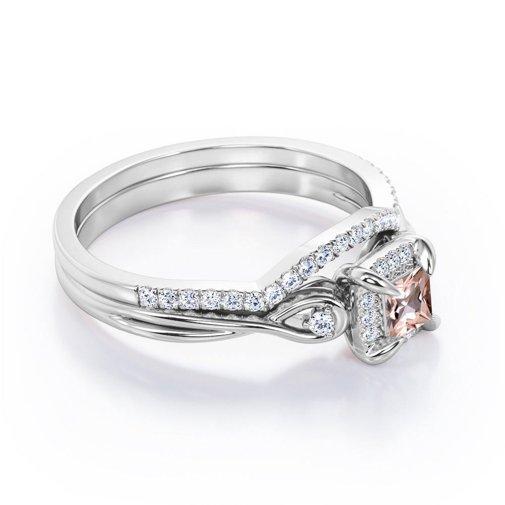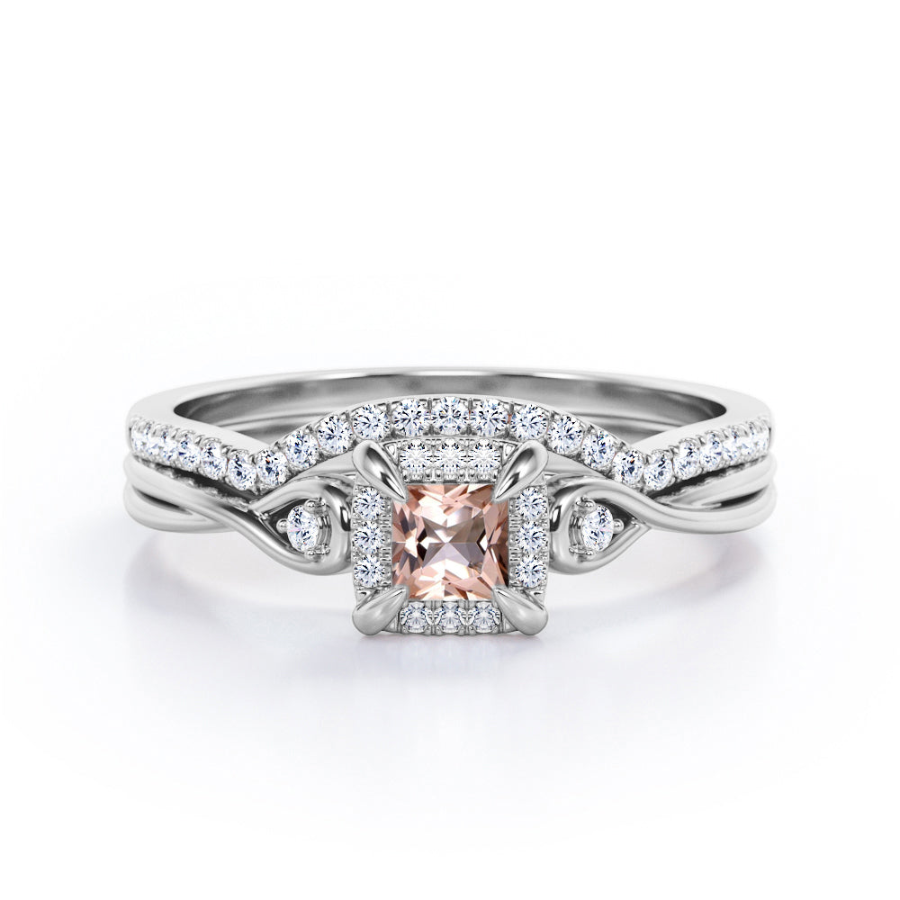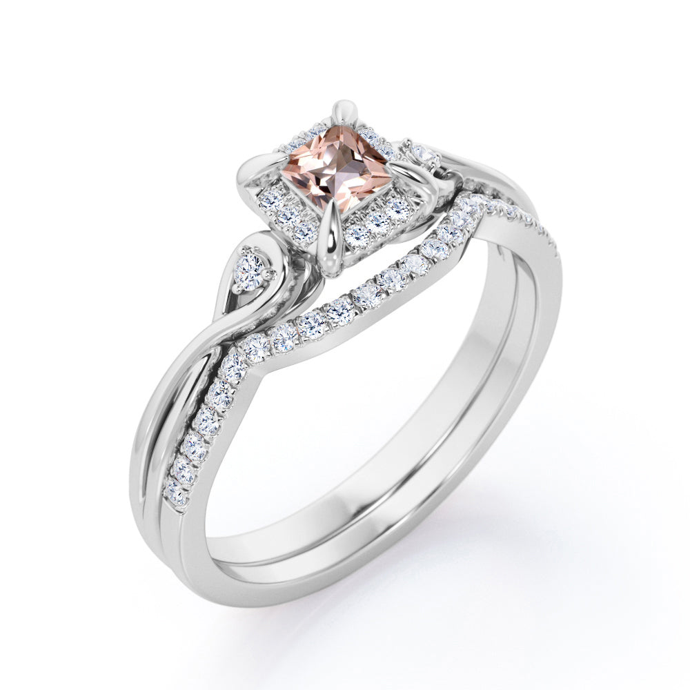 Cushion Halo Prong - 0.85 TCW Princess Cut Morganite and Moissanite - Infinity Split Shank Wedding Ring Set - White Gold