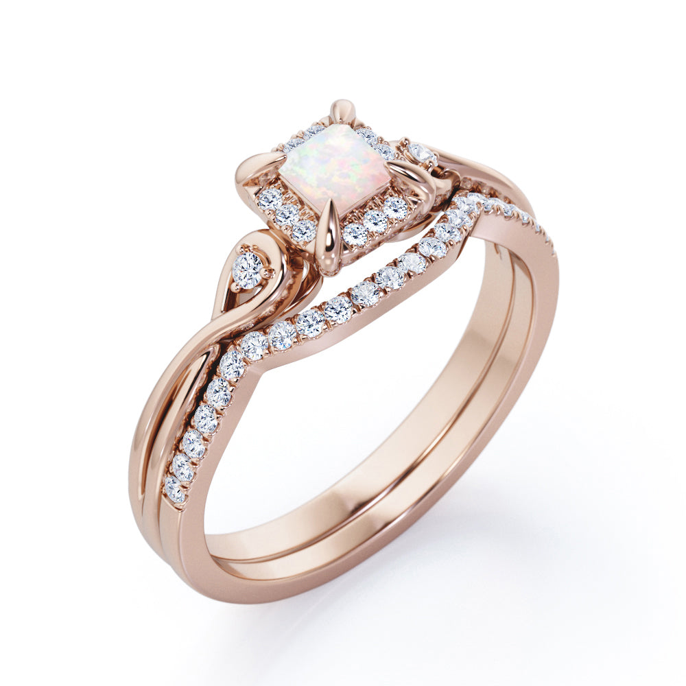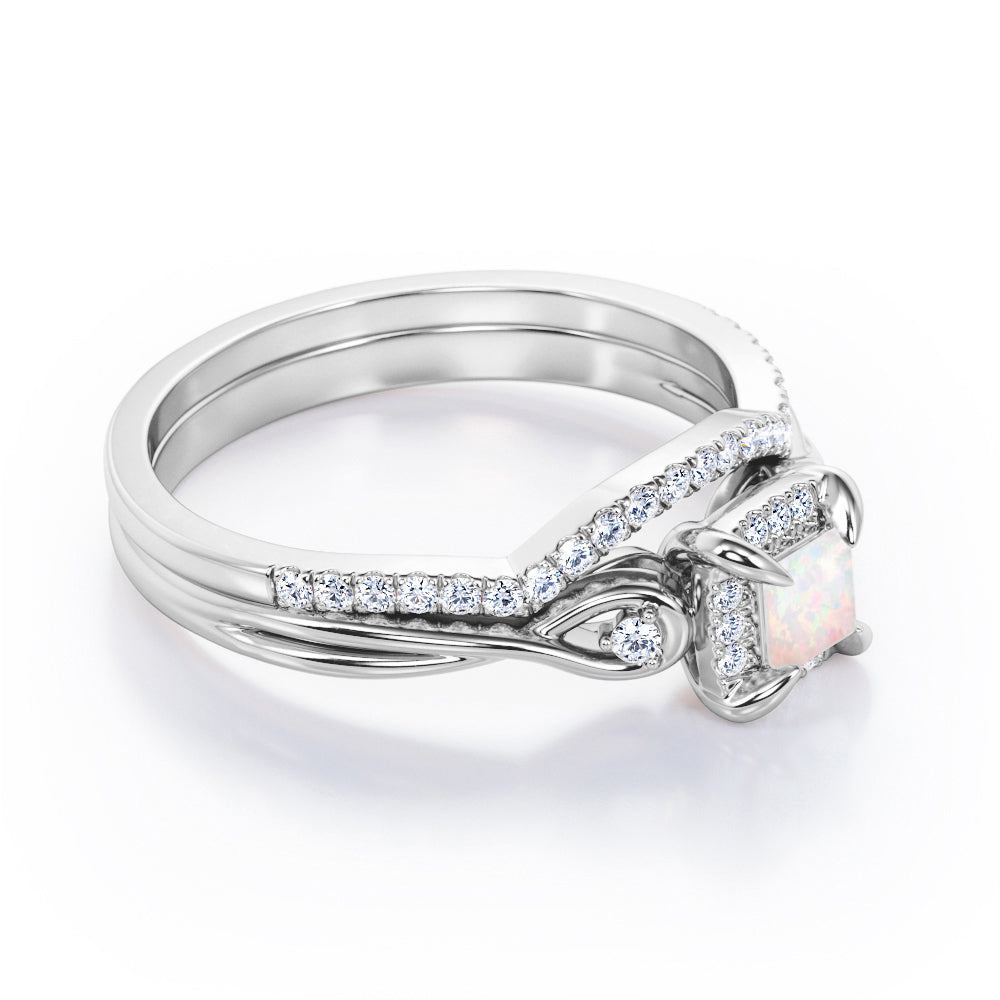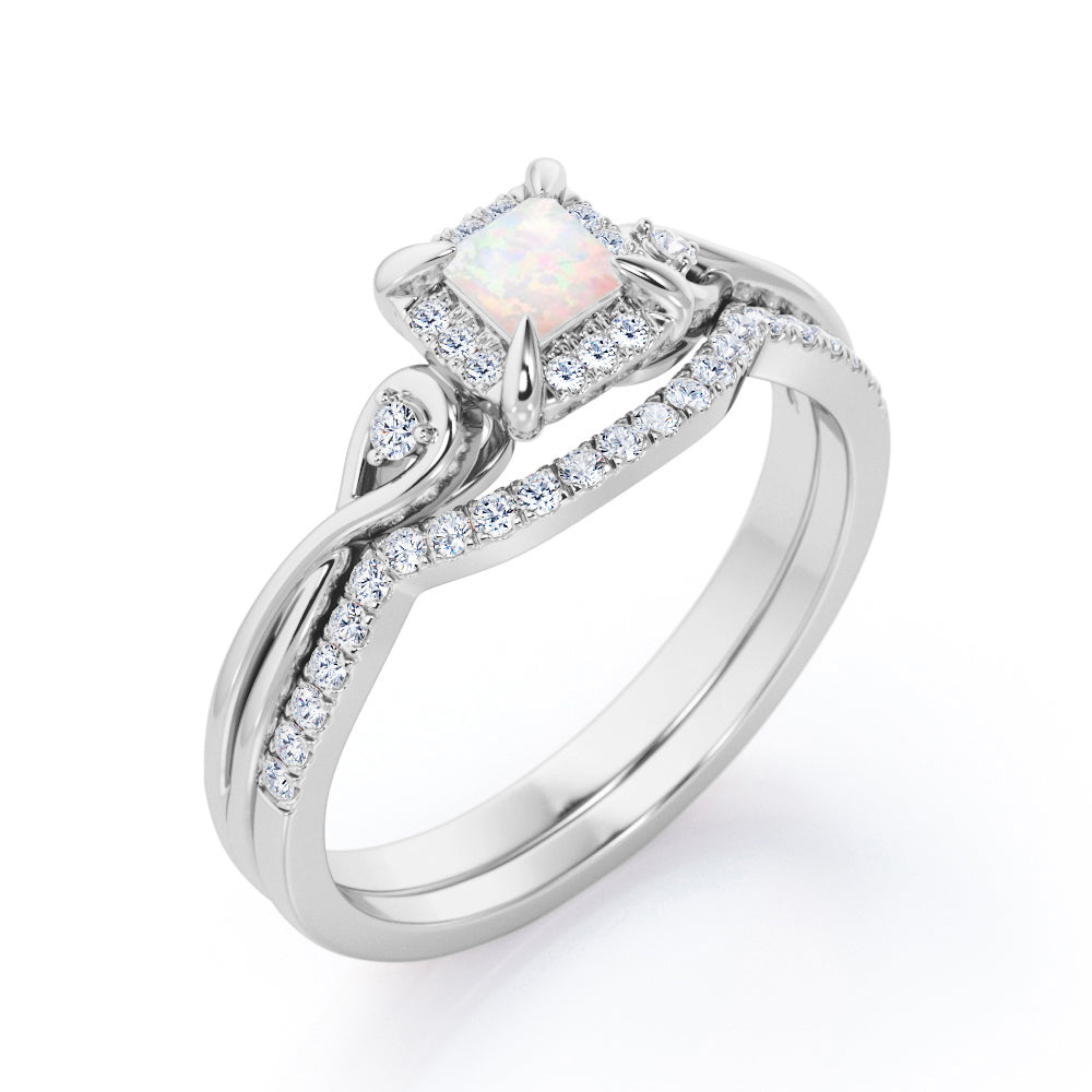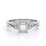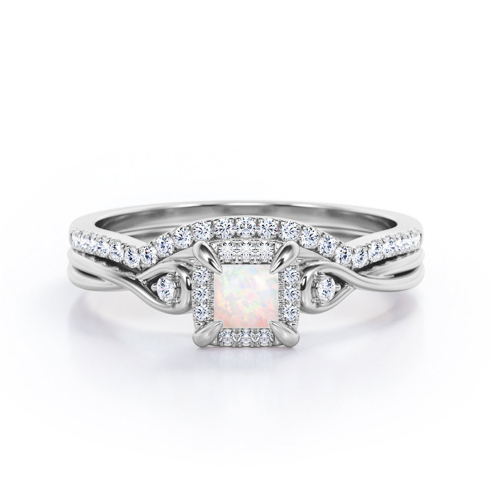 Cushion Halo Prong - 0.85 TCW Princess Cut Opal and Moissanite - Infinity Split Shank Wedding Ring Set - White Gold