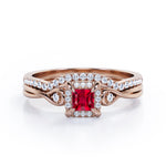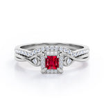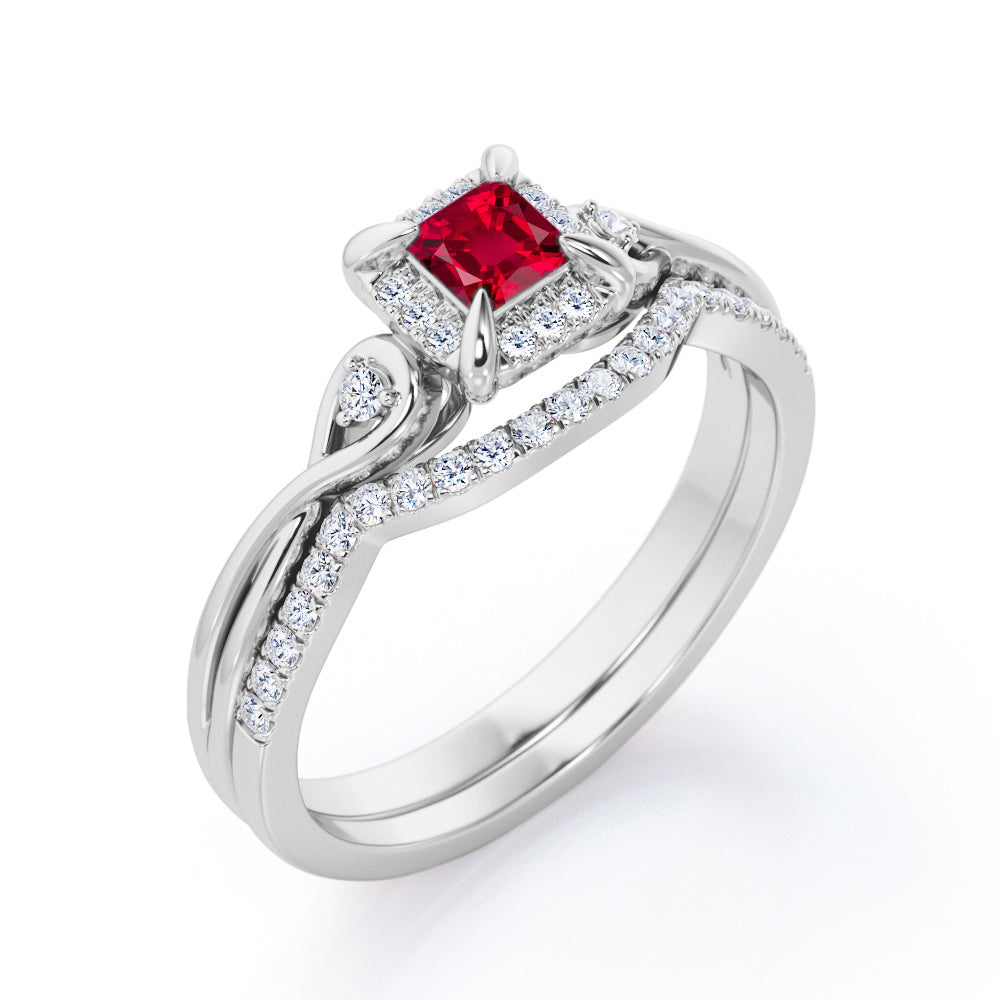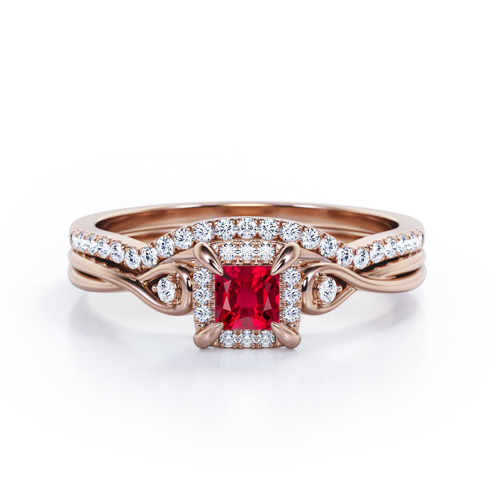 Make your moment more memorable with this Cushion Halo Prong - 0.85 TCW Princess Cut Lab-Created Ruby and Moissanite - Infinity Split Shank Wedding Ring Set - Rose Gold. The engagement ring features a 0.5 carat princess Lab-Created Ruby which is placed in four massive prongs and surrounded by paved round dainty Moissanite. The band is twisted and made into an infinity sign, symbolizing an eternal love that you have for her. Each side of the band houses a dainty round Moissanite which adds more sparkle to the band. Comes with the promise ring is a curved wedding band; it is made into an arch shape and garnished by paved round Moissanite by half of the band. This bridal ring set can be made into 18k gold over silver, 10k gold and 14k gold with the color of white gold, rose gold, yellow gold and black gold.