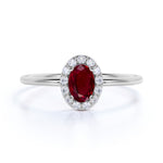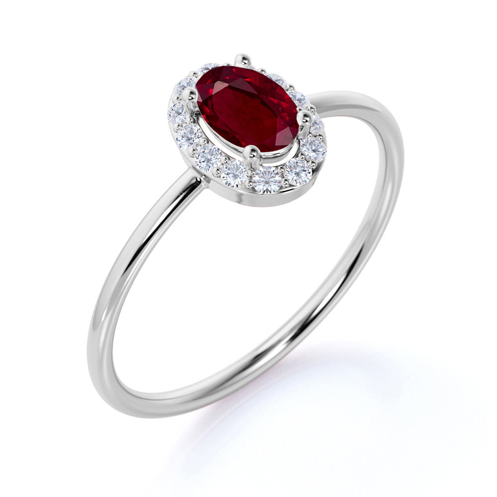 Dainty 0.65 Carat Oval Shape Lab Ruby and Diamond Halo Classic Engagement Ring in White Gold