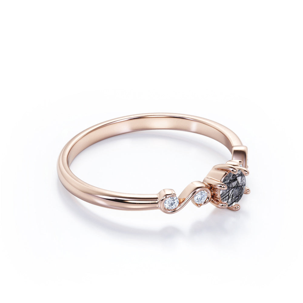 Dainty 6 Prong 0.60 Carat Round Cut Black Hair Dendritic Rutilated Quartz and Diamond Twist Engagement Ring