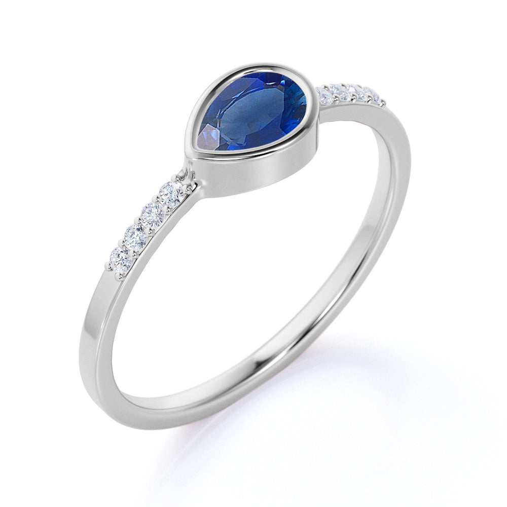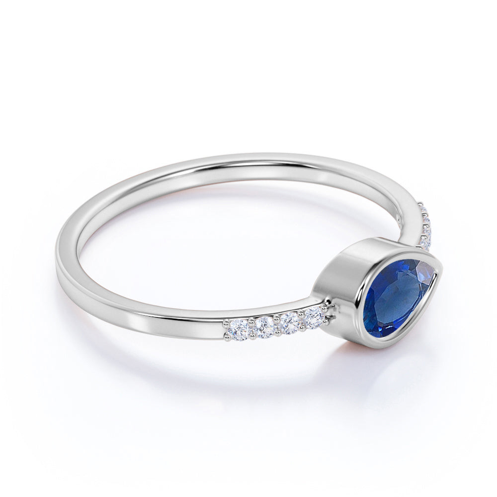 Dainty Bezel 0.75 Carat Pear Bright Blue Sapphire and Diamond East West Engagement Ring in White Gold