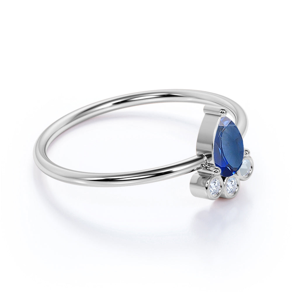 Dainty Bezel Set Pear Shape Peacock Blue Sapphire and Diamond Unique Engagement Ring in White Gold