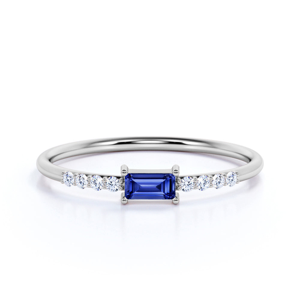 This small dark blue sapphire ring is also considered the new vintage art deco engagement ring, because of its art deco style that is unique and one of a kind ring design. If you are looking for a modern east west blue sapphire ring and at the same time this is a great choice for an engagement ring. This ultra thin blue sapphire ring features an approximately .35 carat emerald cut genuine blue sapphire, surrounded by .10 carat authentic diamond accent, for a total weight of 0.45 carats.