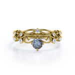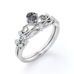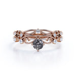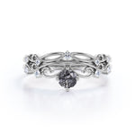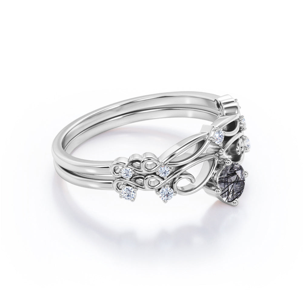 Dainty Filigree 0.65 Carat Round Cut Druzy Black Rutilated Quartz and Diamond Contour Solitaire Wedding Set Rings