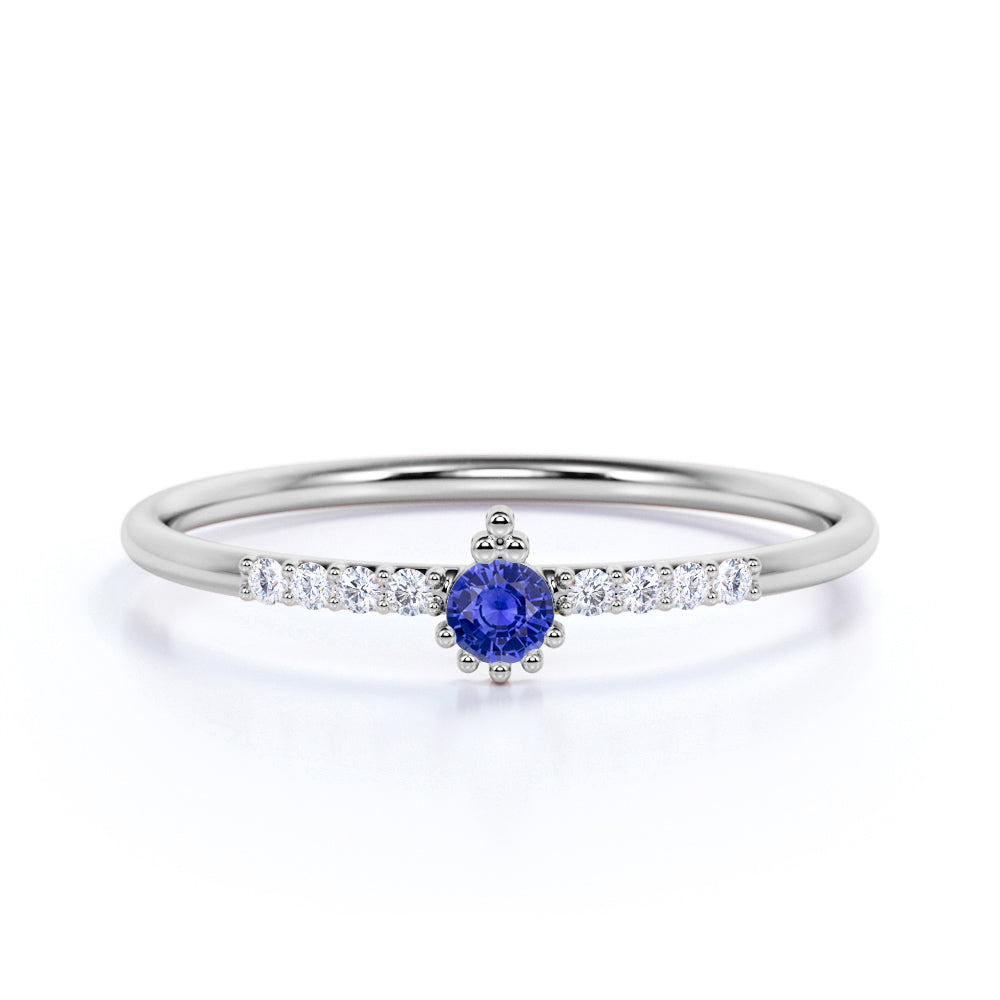Dainty Round Cut Purplish Blue Sapphire and Diamond Beaded Engagement Ring in White Gold