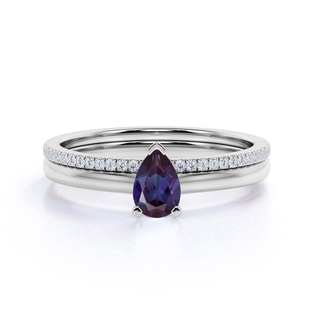 Dainty Single Stone 0.75 Carat Pear Shape Lab Created Alexandrite and Diamond Pave Wedding Ring Sets