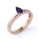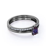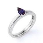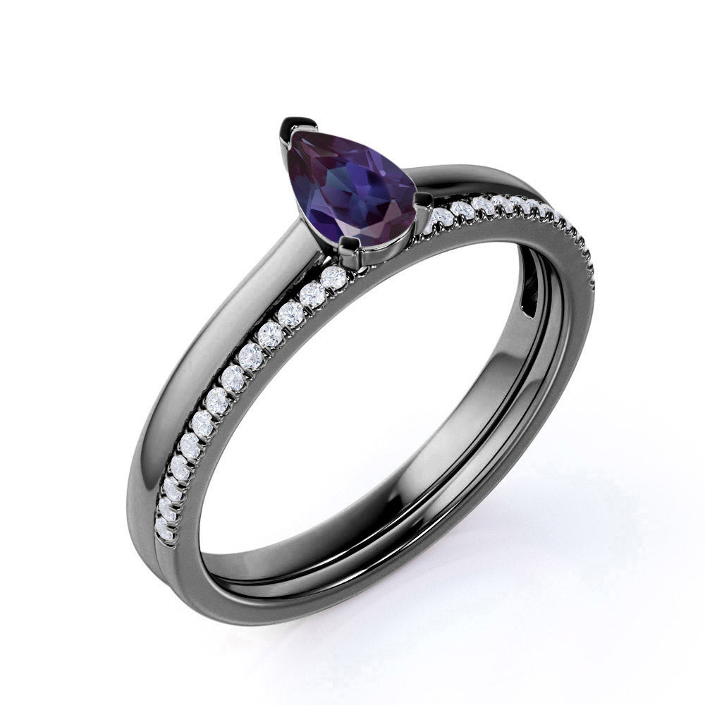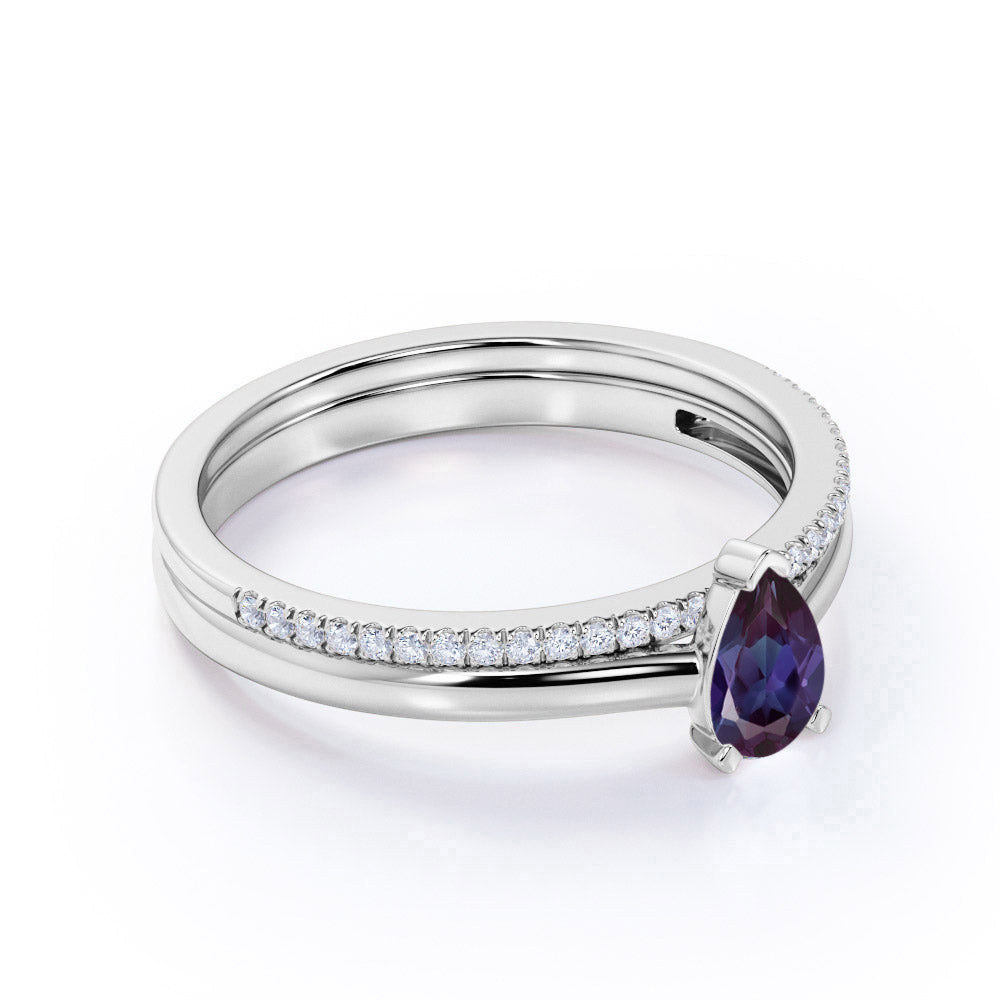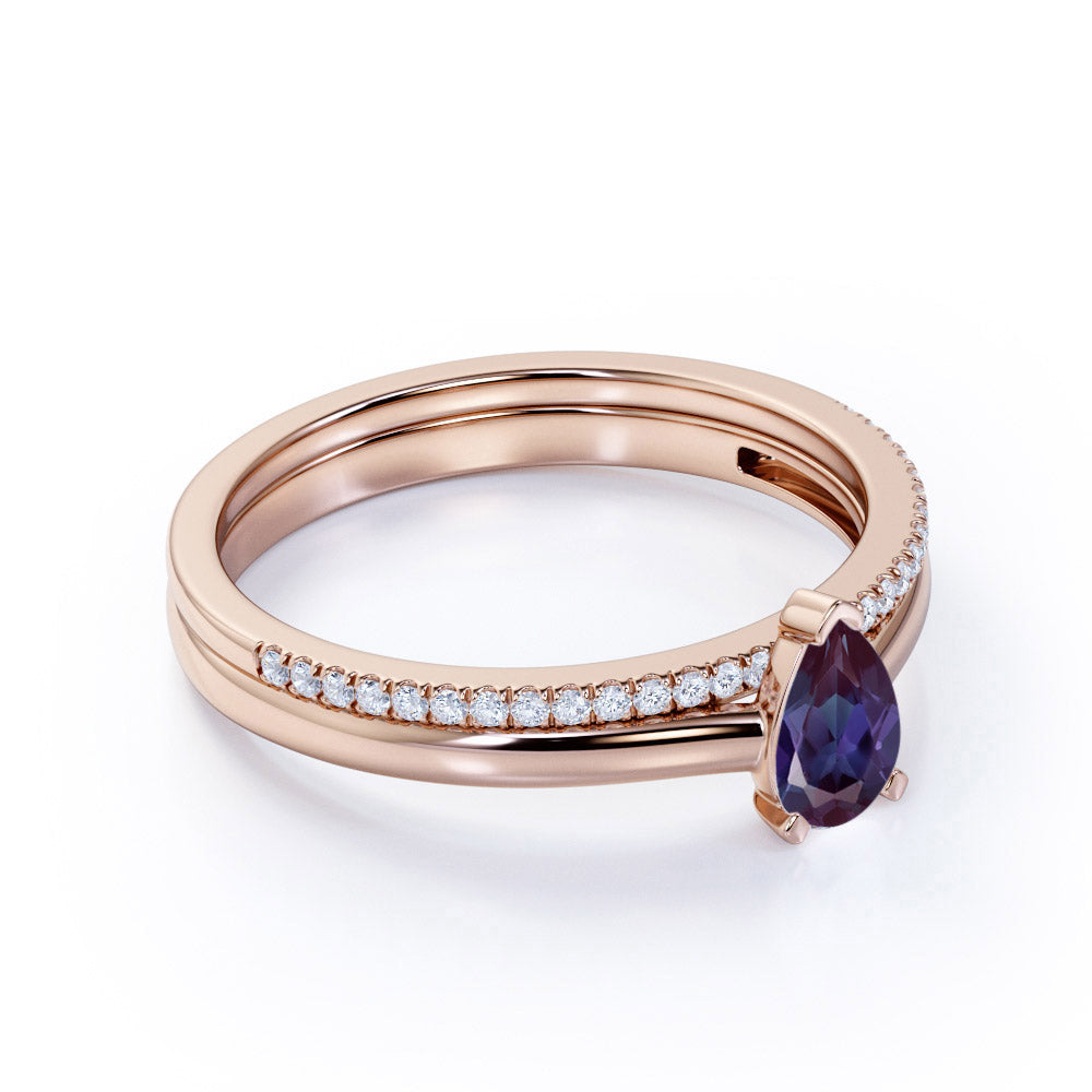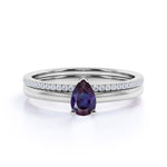Dainty Single Stone 0.75 Carat Pear Shape Lab Created Alexandrite and Diamond Pave Wedding Ring Sets