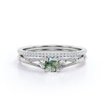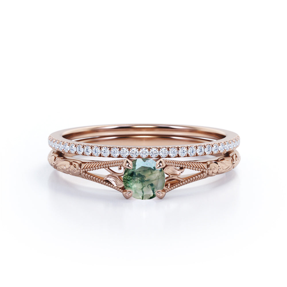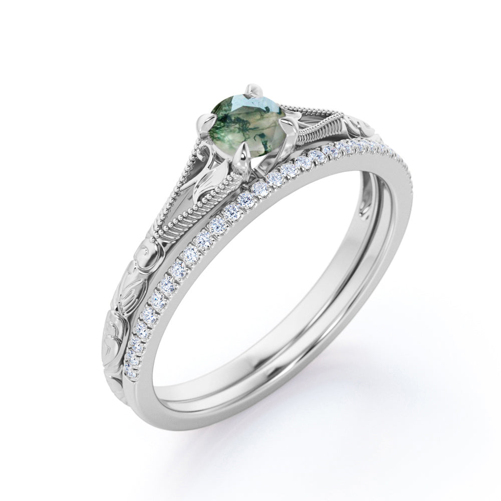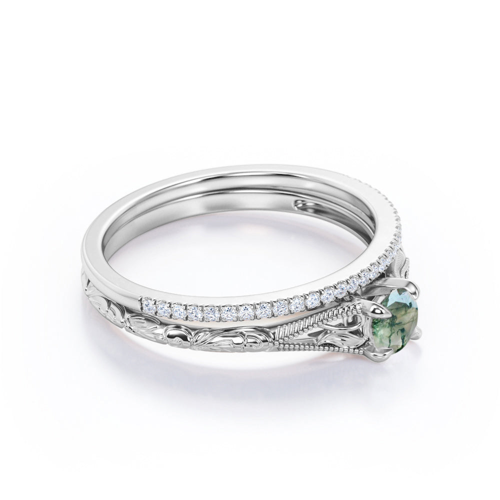 Dainty Solitaire 1.25 Carat Round Cut Genuine Dendritic Moss Agate with Diamond Pave Band Art Deco Wedding Ring Sets