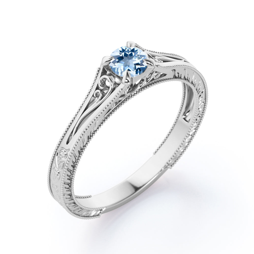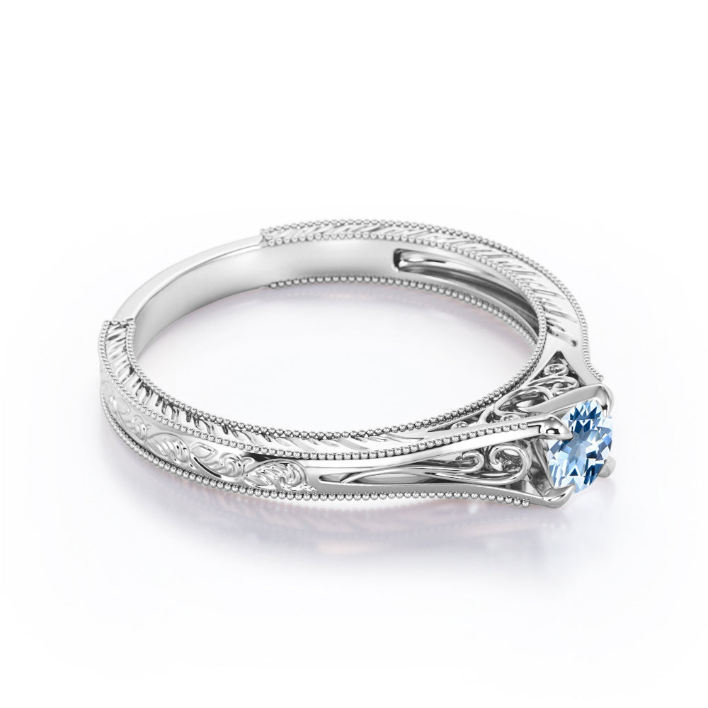 Dainty Solitaire 0.5 Carat Round Cut Real Aqua Sky Blue Aquamarine Filigree Engagement Ring