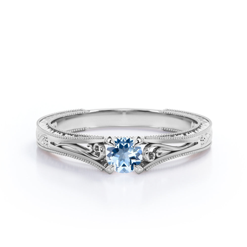 Dainty Solitaire 0.5 Carat Round Cut Real Aqua Sky Blue Aquamarine Filigree Engagement Ring