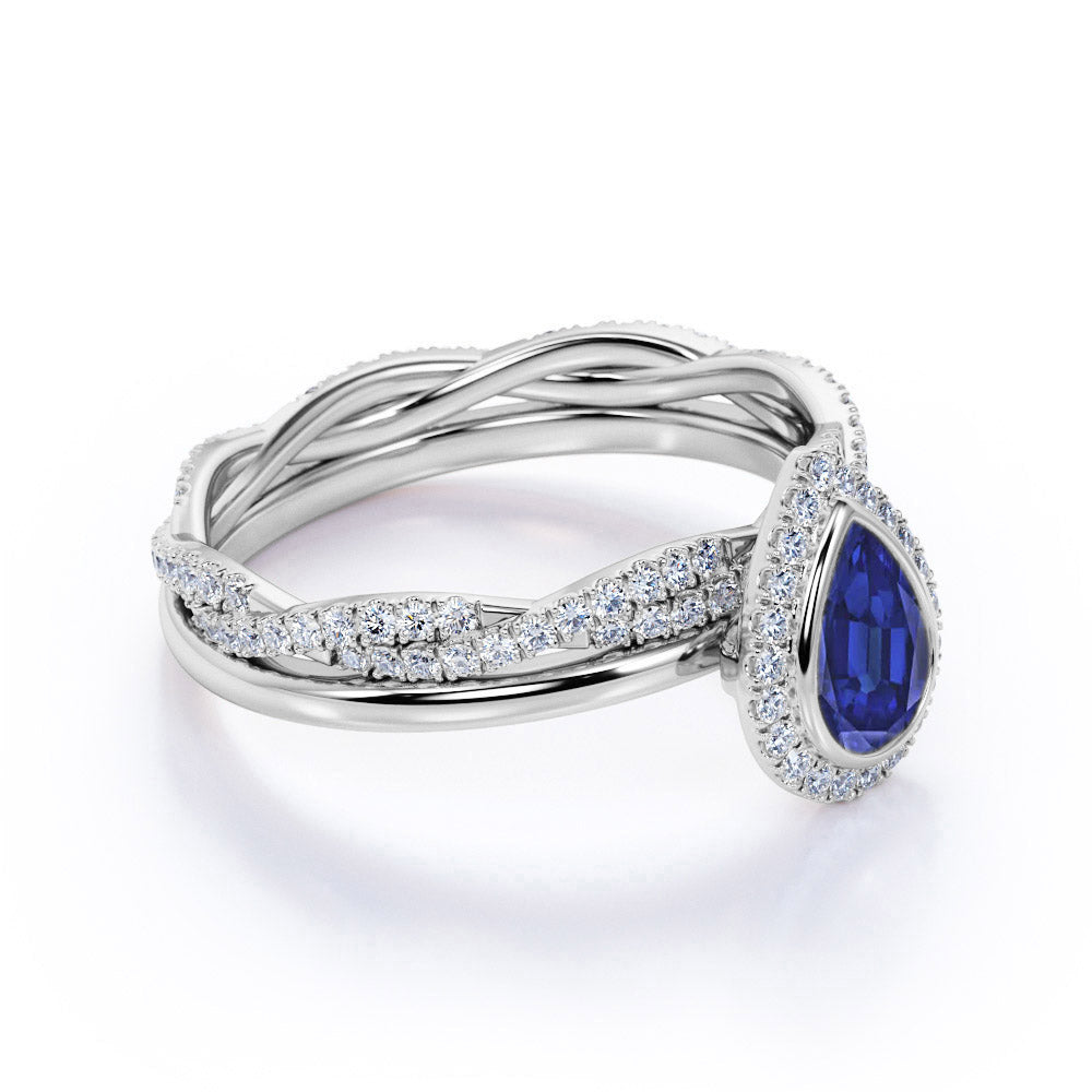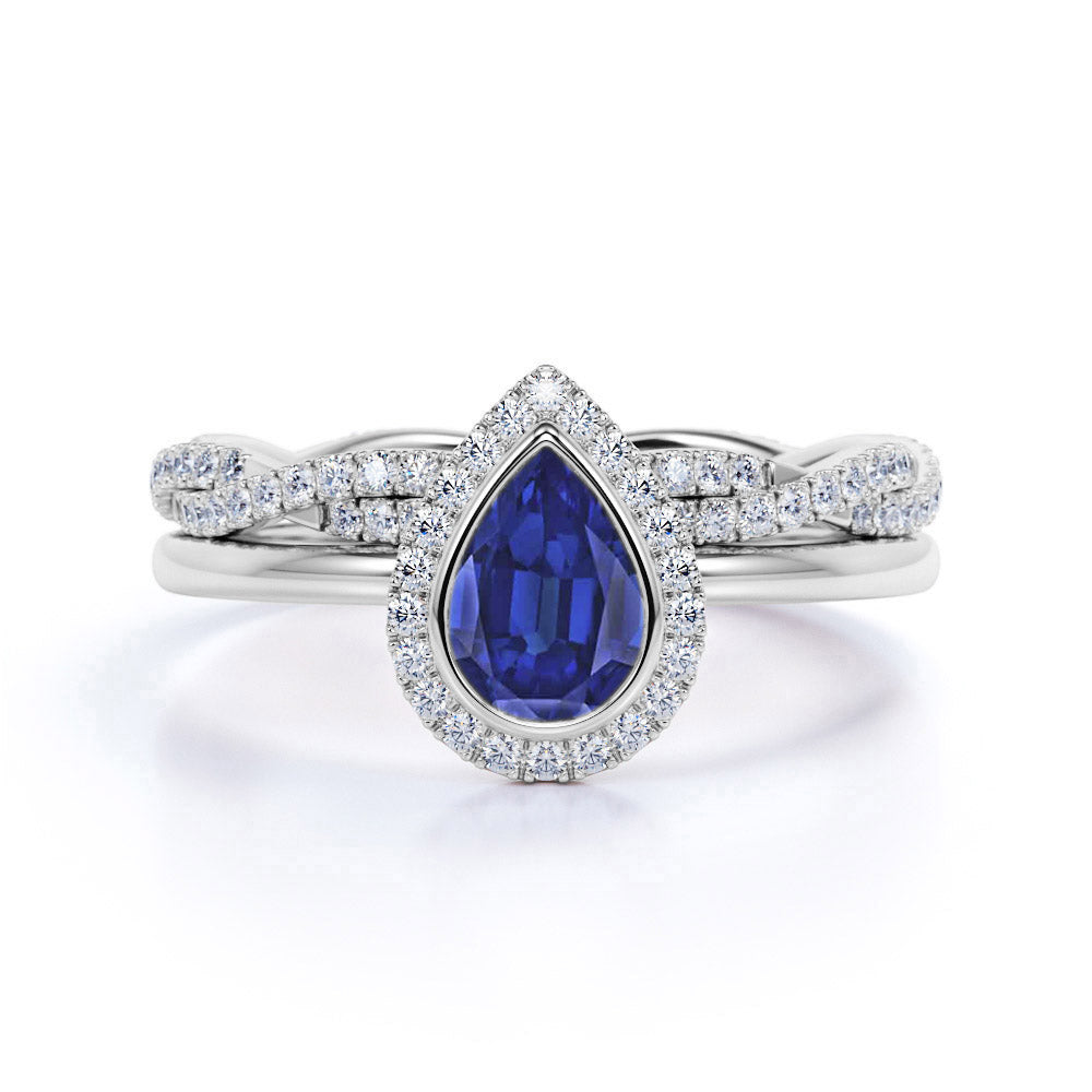 Dazzling Bezel Set 2.25 Carat Pear Cut Sapphire and Diamond Halo Bridal Set with Infinity Band in White Gold