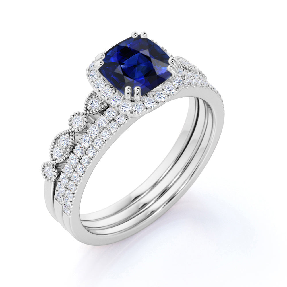 2 Ct Cushion Cut Lab Sapphire Art Deco Trio Set