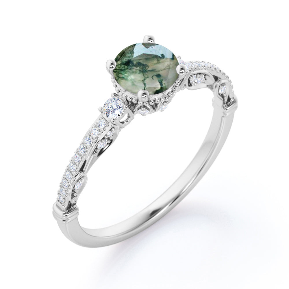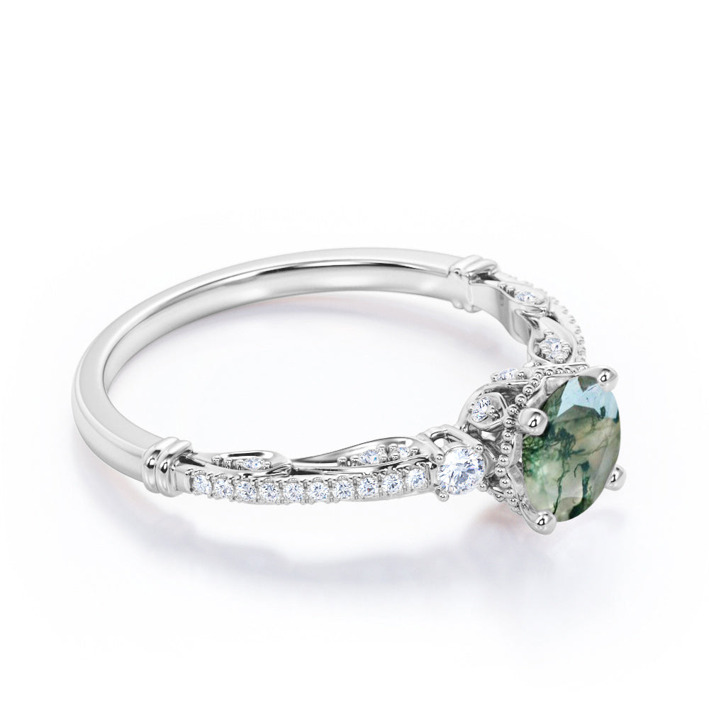 Decorative Basket 0.75 carat Round Moss Agate and Moissanite Engagement Ring in White Gold