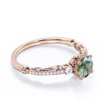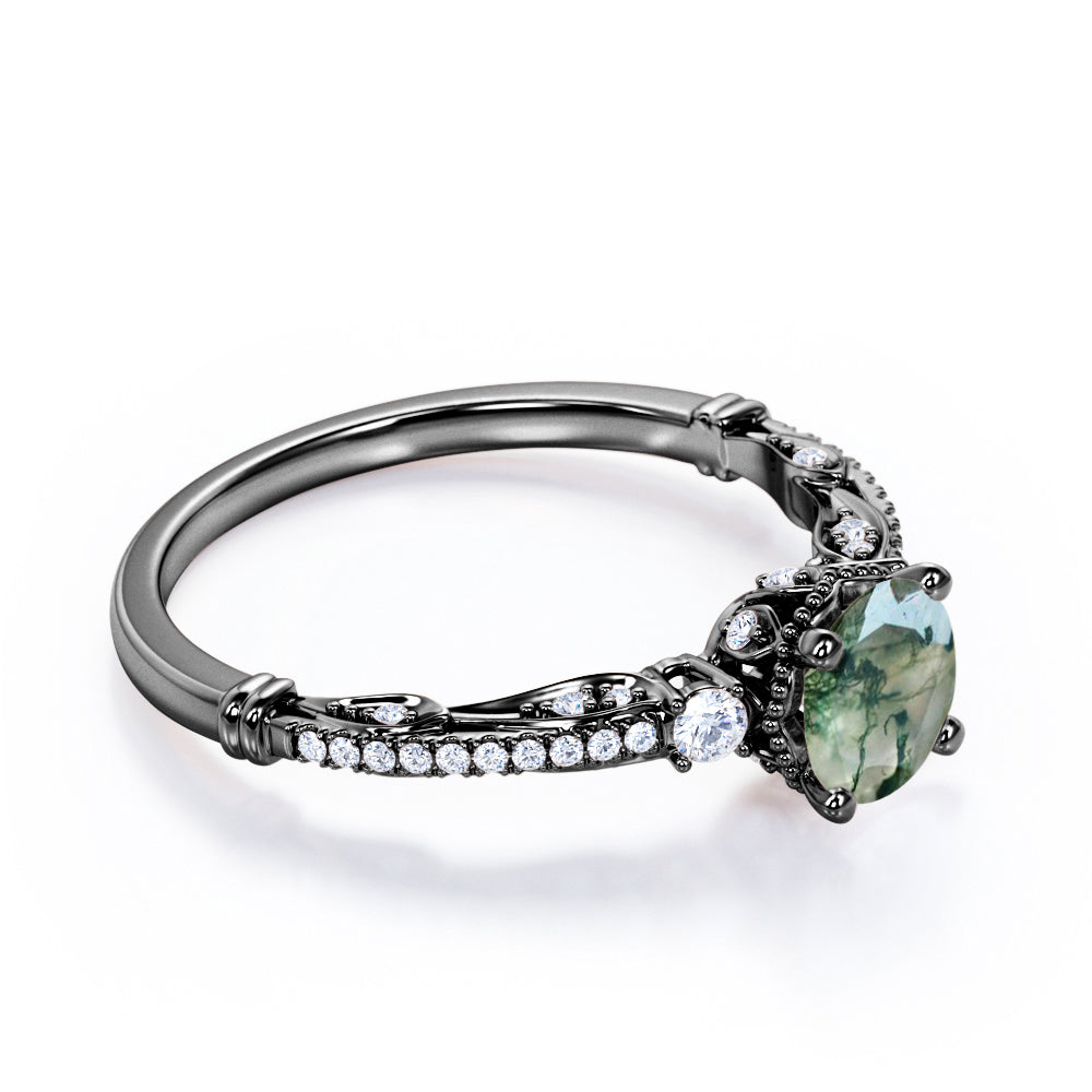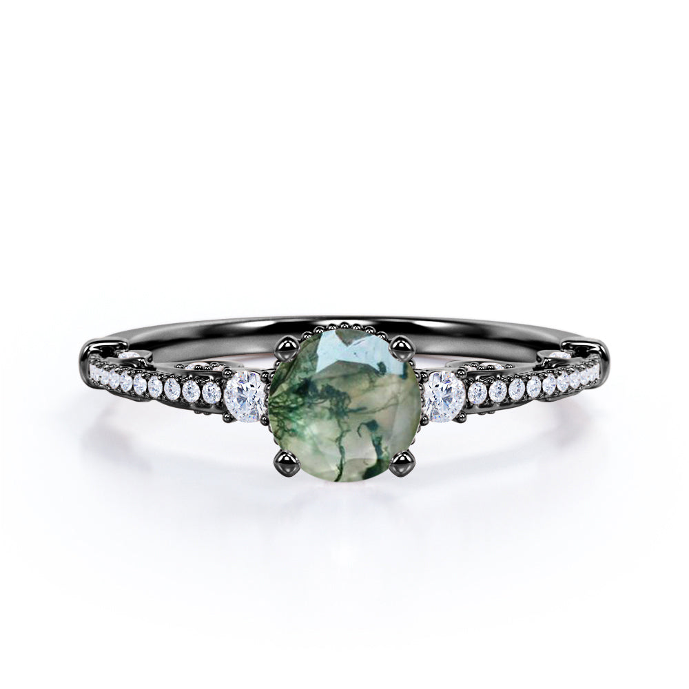 If you are looking for a perfect gift for your special one. This Decorative Basket 0.75 carat Round Moss Agate and Moissanite Engagement Ring in White Gold will enchanted her. This art deco engagement ring boasts 0.5 carat round Moss agate with 0.25 carat round Moissanite. Our authentical Moss agate is placed in a fancy basket; the beautiful green stone illustrates lichen pattern and outstands on a crown base that adorns dainty Moissanite and decorated with Milgrain. This lovely design adds a feminine side to the classic ring. Next to green Moss agate are round Moissanite and petite Moissanite cascade down the shoulder of the band. Side of the band is well crafted in nature-inspired leaf and vine pattern. You can choose either white gold, rose gold, yellow gold or black gold that will match her. The natural moss agate promise ring can also be customized in to 18k gold over silver, 10k gold, 14k gold and 18k gold.