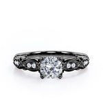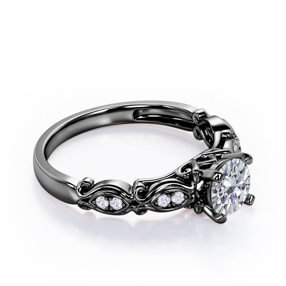 Once upon a fine jewelry, there is a Decorative Basket Prong 0.5 carat Round Moissanite and Diamond Nature-Inspired Ring in Rose Gold. This engagement ring showcases a 0.5 carat round Moissanite on a basket setting that if you look from the side, you will see an intricate design that looks like a royal crown from a fairytale. The band also features two roses that are about to bloom on each side, they hold two dainty round Moissanite within. It can be made in 18k gold over silver, 10k gold and 14k gold which you can also choose the right color for your princess. 4 colors are available for you to choose at a very affordable price; white god, rose gold, yellow gold and black gold.