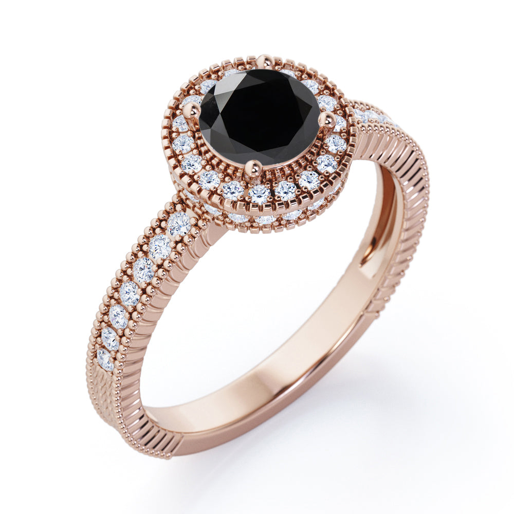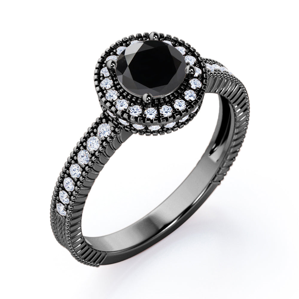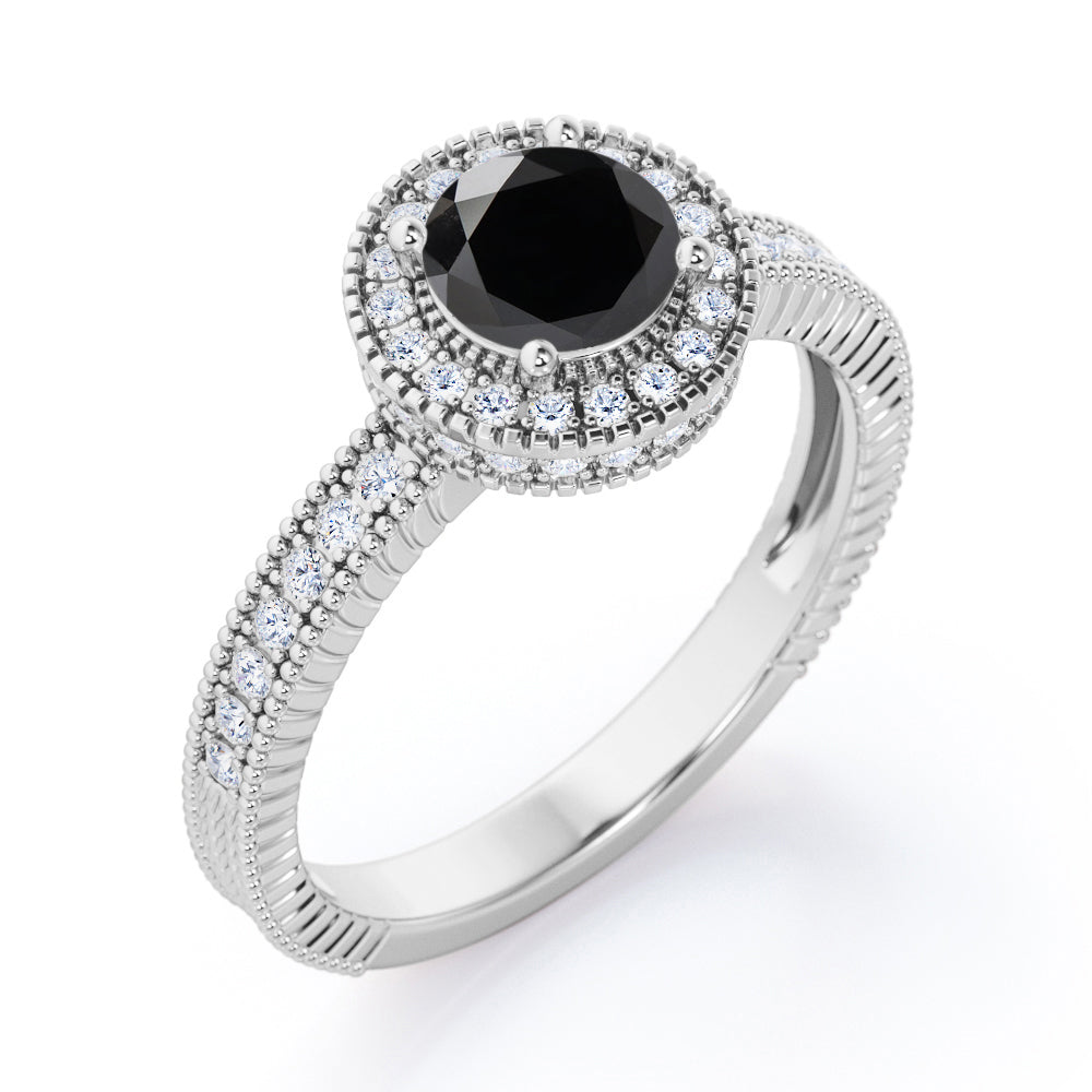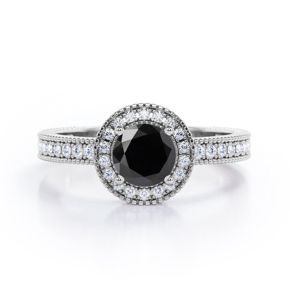 Decorative Halo 1 carat Round Black Diamond Milgrain Engagement Ring in White Gold