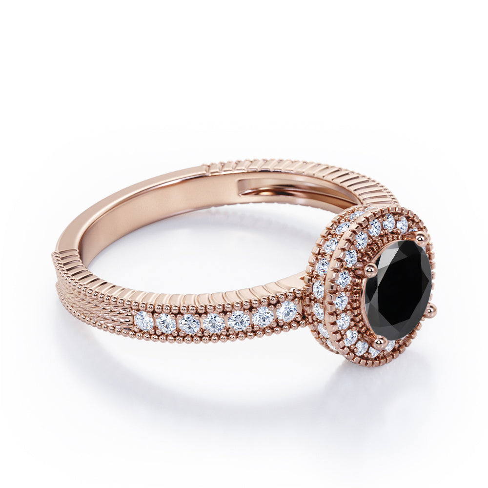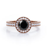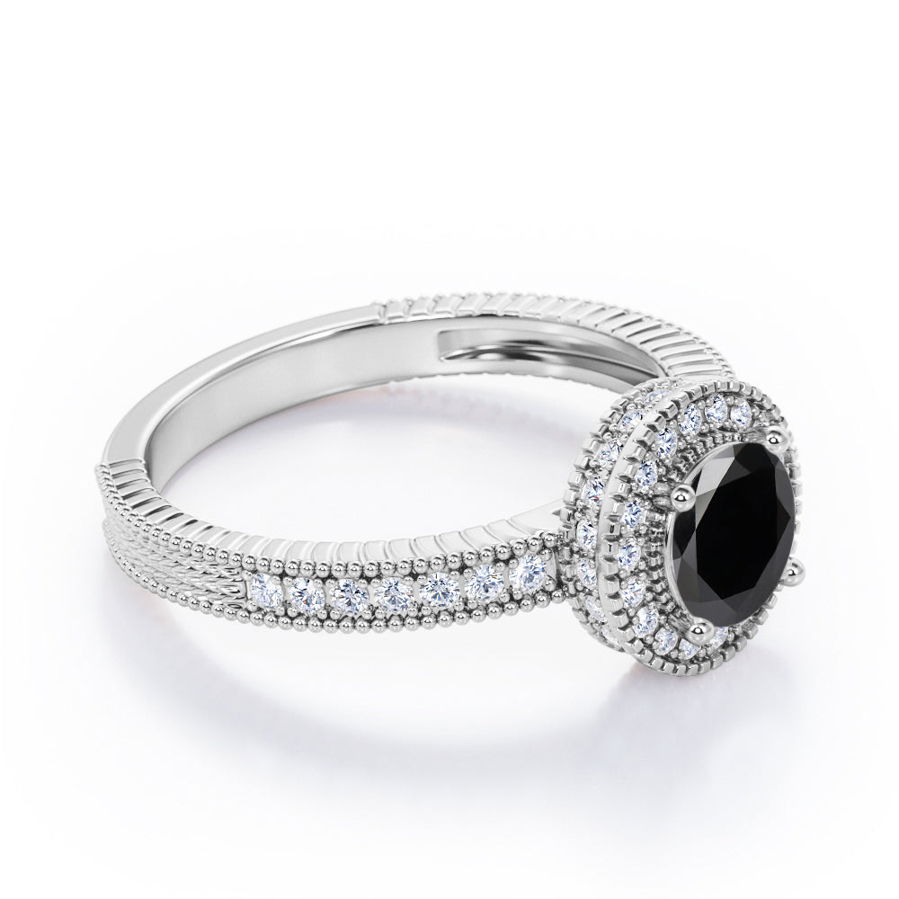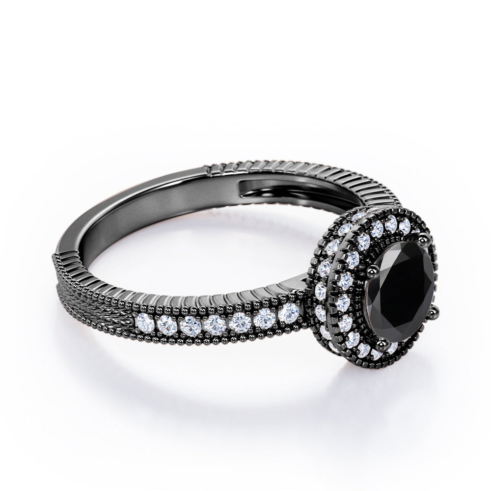 Decorative Halo 1 carat Round Black Diamond Milgrain Engagement Ring in White Gold