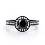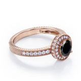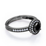 If you are looking for a perfect vintage ring, you might want to take this Decorative Halo 1 carat Round Black diamond Milgrain Engagement Ring in White Gold under the consideration. A 0.5 carat round Black diamond is featured in in the center and surrounded by dainty round diamonds that is edged with a castle line. The design continues to side of the halo, making the whole piece look like a spinning wheel. Petit round diamond stones are employed by half of the band along with Milgrain and straight line pattern. The ring can be made to your choice of 18k gold over silver, 10k gold and 14k gold with the color of white gold, rose gold, yellow gold and black gold.