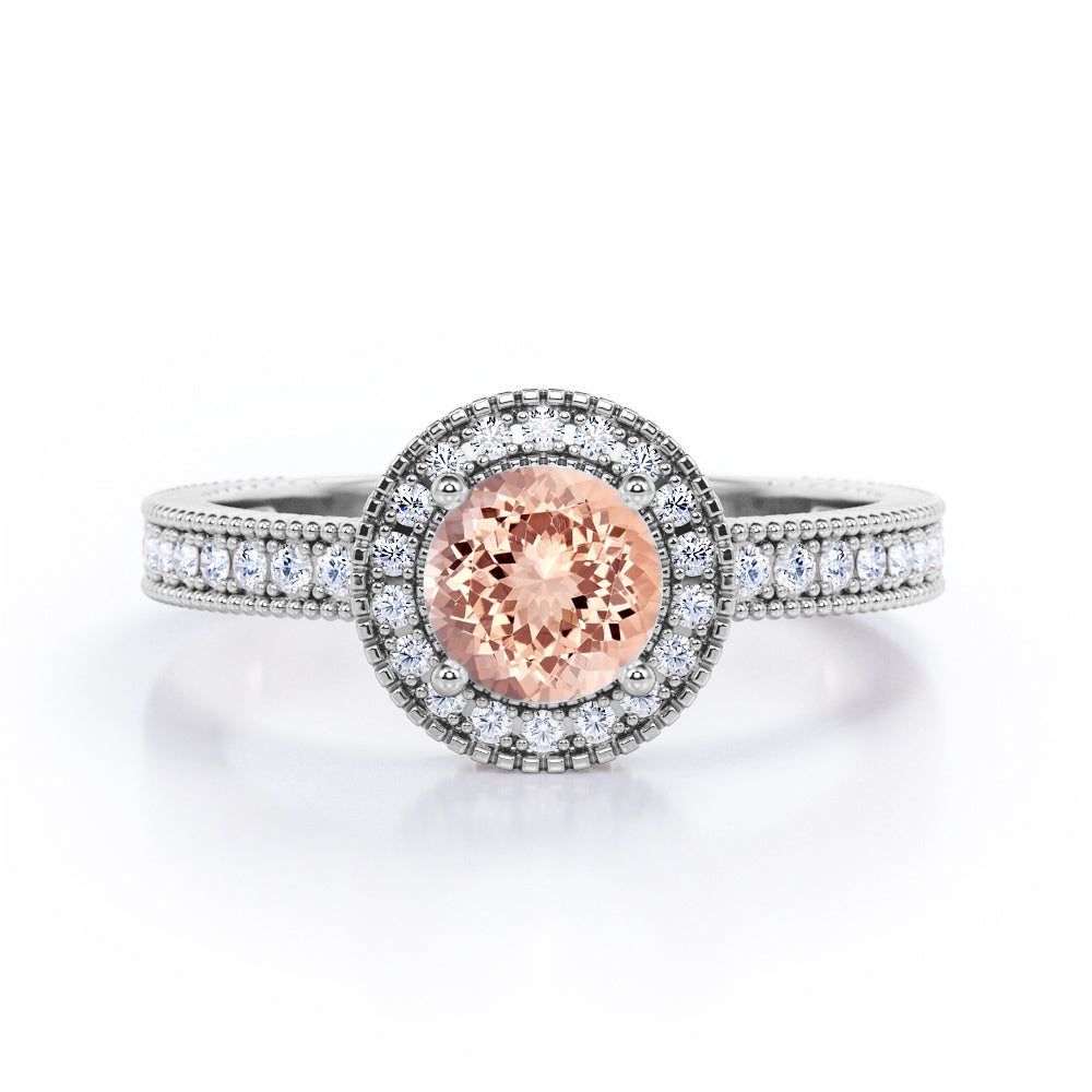 Decorative Halo 1 carat Round Morganite and Diamond Milgrain Engagement Ring in White Gold