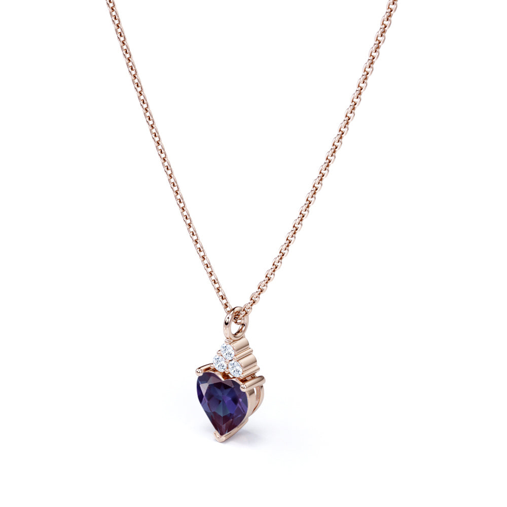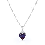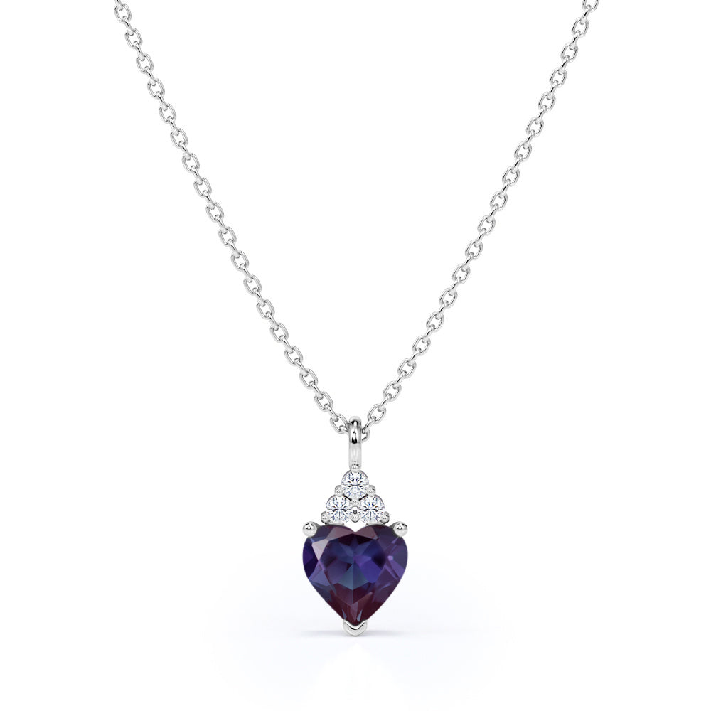 Delicate 1.05 Carat Heart Shaped Lab Created Alexandrite and Diamond Three Prong Pendant Necklace In White Gold For Her. Make a statement with our heart shaped alexandrite and diamond necklace. Consider a solitaire lab created alexandrite and diamond pendant for a necklace that won't overpower your wardrobe. A dynamic purple 1 carat alexandrite is holded by three prongs and three dainty round white shimmering diamonds of 0.5 carat sits on the top. You can pair it with minimal earrings in either casual or formal attire so your necklace stands out. Handmade with utmost love and devotion, this delicate 1.05 carat heart shaped lab created alexandrite and diamond three prong pendant necklace in white gold for her can also be customised to 18k Gold plating over silver, 10k Gold or 14k Gold as per your preference. Simply press the add to cart button now and make this alluring piece yours forever.