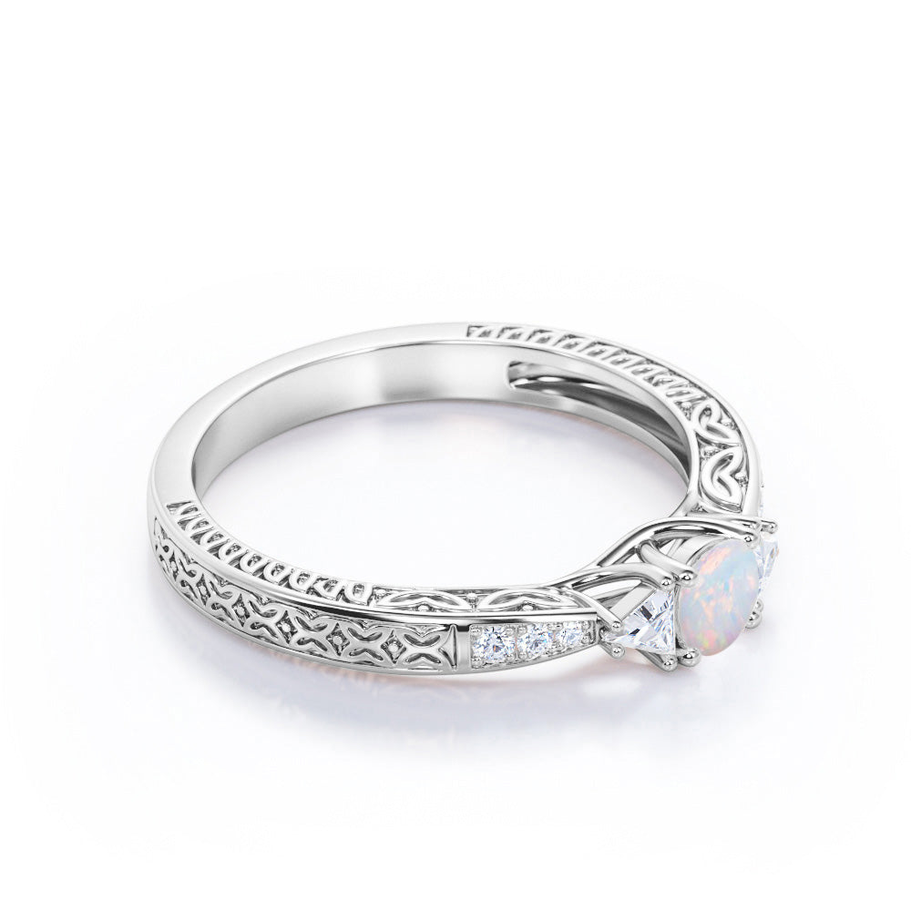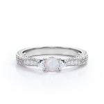 Delicate Four Prong 1.25 Carat Round Cut Fire Opal And Diamond Vintage Filigree Engagement Ring In Rose Gold. Make your loved ones feel special by surprising them with our customized handmade genuine opal diamond engagement ring. This engagement ring features 1 carat fire opal at the center which is surrounded by 0.20 carat of sparkling white diamonds. The round cut opal center stone is flanked by two triangle cut diamonds on either side which gives a distinctive look. She is going to love this round cut vintage style ring in white gold. This modern art deco diamond ring is one of our new opal rings collection. Our craftsmen created this antique design in the style of Victorian and Art Deco periods of our past. This four prong engagement ring features fascinating art deco as well as filigree design which is extremely eye-pleasing. This delicate four prong 1.25 carat round cut fire opal and diamond vintage filigree engagement ring in rose gold can also be customized to 18k Gold plating over silver, 10k Gold or 14k Gold as per your preference.