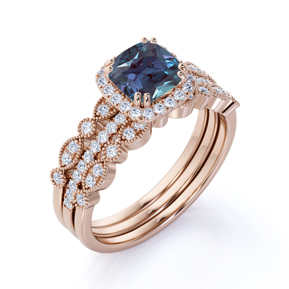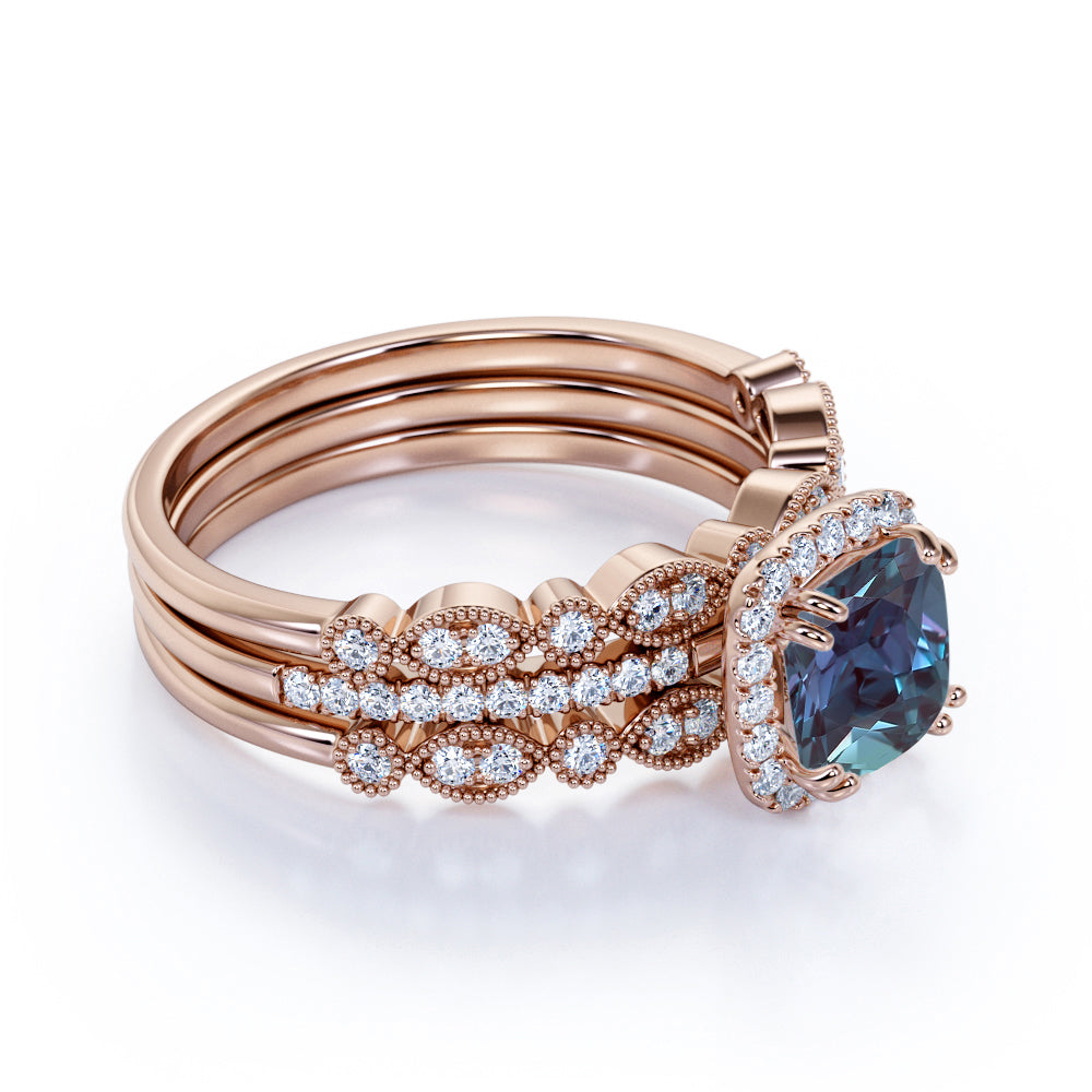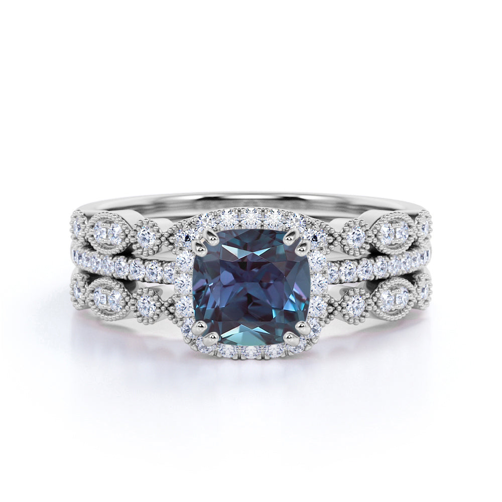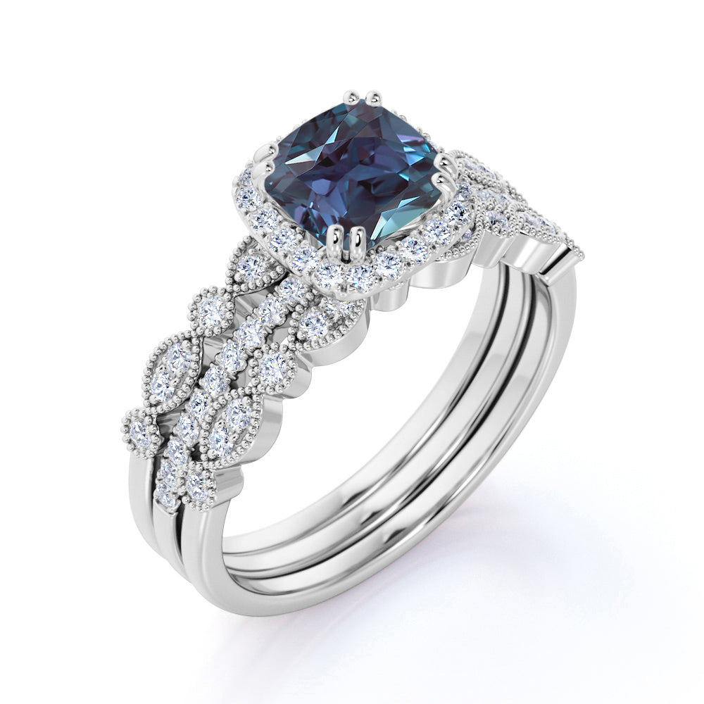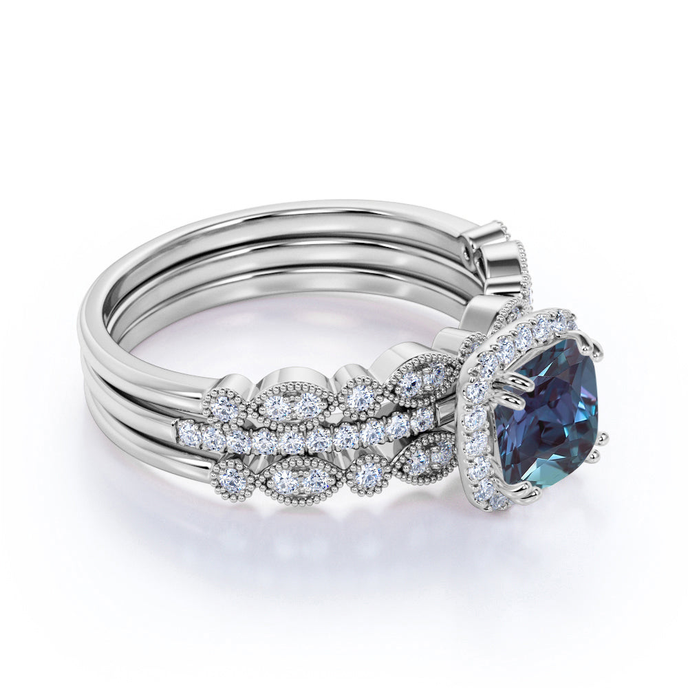 Delicate Halo 2 Carat Cushion Cut Created Alexandrite and Diamond Art Deco Bands Trio Bridal Set Rings