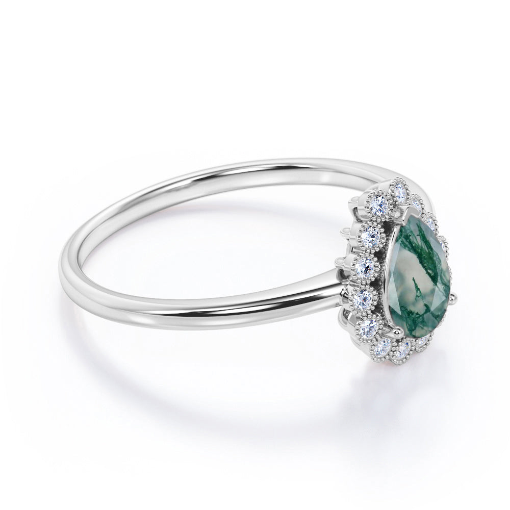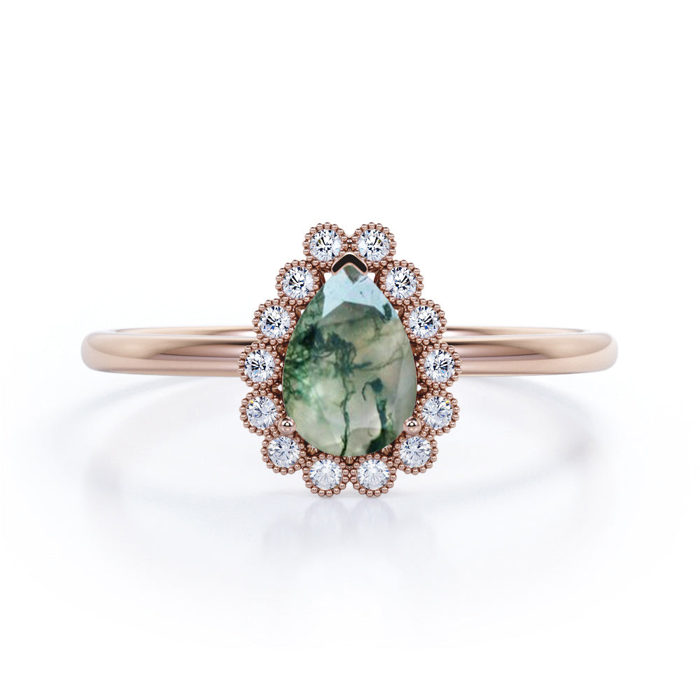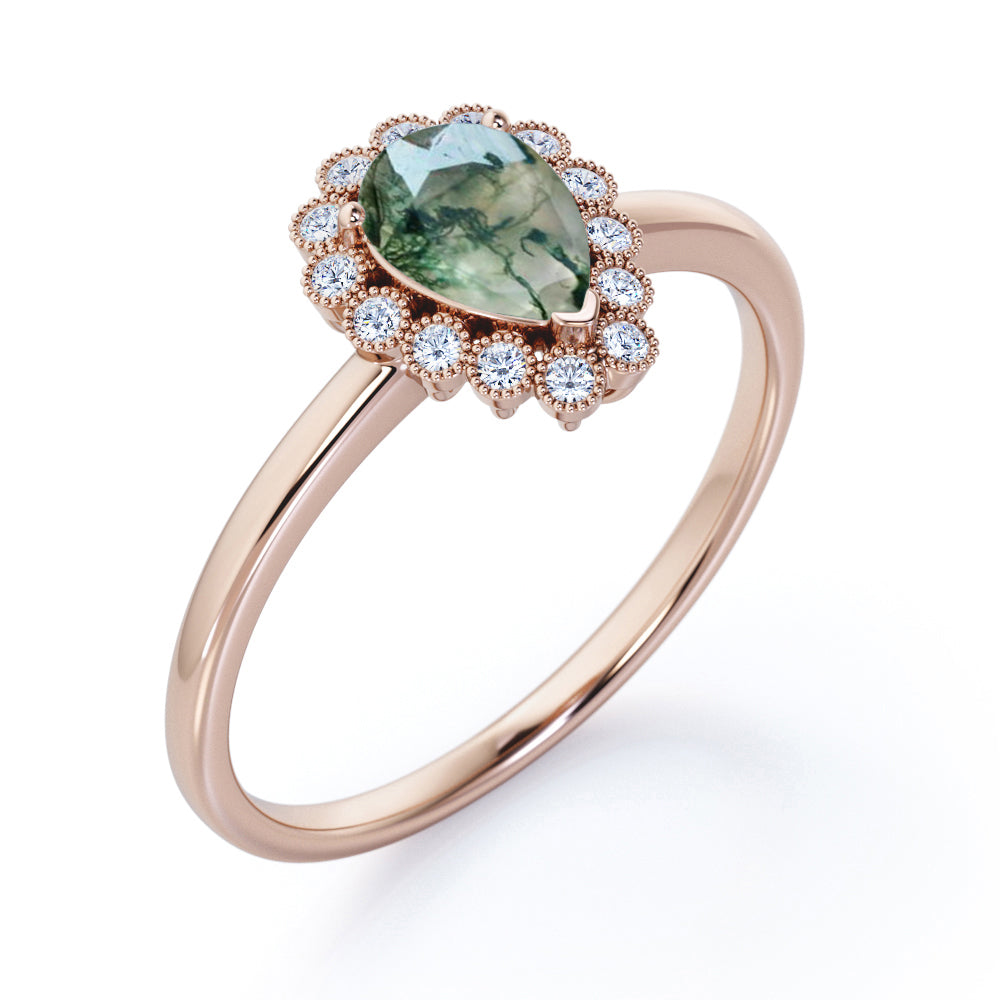 Paint your love story with this Delicate Minimalist 1.50 Carat Pear Shape Milky Dendritic Moss Green Agate and Diamond Floral Cluster Engagement Ring in Rose Gold. This delicate flower cluster banded moss green Agate engagement ring features 1.25 carat pear cut real moss green agate and .25 carat real side diamond for gold ring and moissanite for silver ring. This minimalist ring can be customized to either 10k, 14K and Gold over Silver and either Black Gold, Rose Gold, White Gold or Yellow Gold. Also, as your satisfaction is our most priority, we will do our best to have your handmade jewelry be carefully and beautifully crafted by our expert jewelers. The order also comes with a 30-day full refund policy. This green colored minerals with banded inclusions ring will surely be a perfect gift for your special someone. It is well-known for spiritual and healing power. Encourage trust and hope with this real green Agate ring that shows a variety of white with green inclusions that resembles moss. Due to its unique milky white color with green dendritic inclusions, this vintage moss green Agate ring is sure to enchant its wearer. With its long history and many oral traditions around the world, this delicate druzy moss green Agate ring is sure to be eye-catching and bring all eyes on you. Create a fascinating look on your finger with this moss green Agate ring which is available in both solid gold and sterling silver. It perfectly fit those who are looking for a very unique ring that no two rings are alike. Being considered a very lucky omen, this natural banded moss green Agate ring encourages the gradual growth of what you currently need most in your life. Those who has a penchant for vintage and flawless ring would completely fall in love with this ring. It is the perfect match for those who are looking for a remarkable gemstone rings as moss green Agate embodies their own unique intriguing patterns and uplifting meaning.