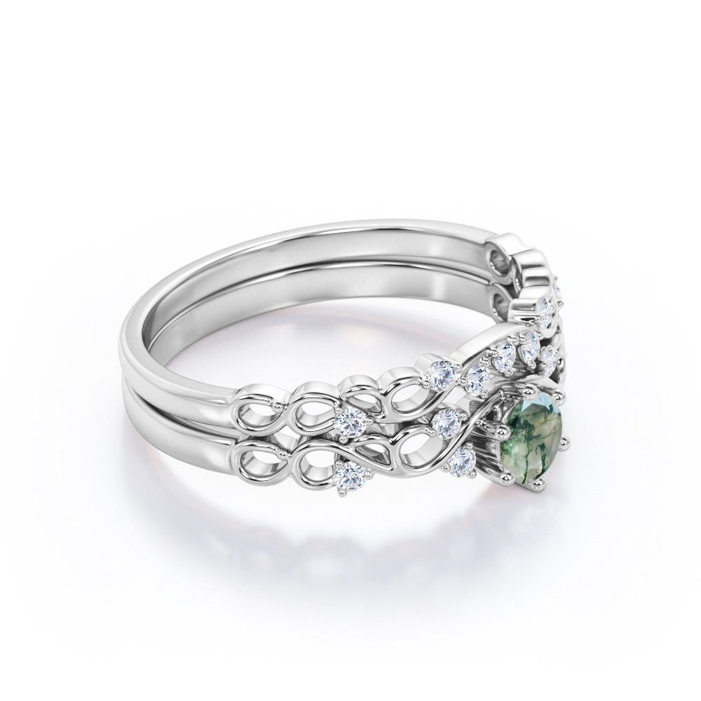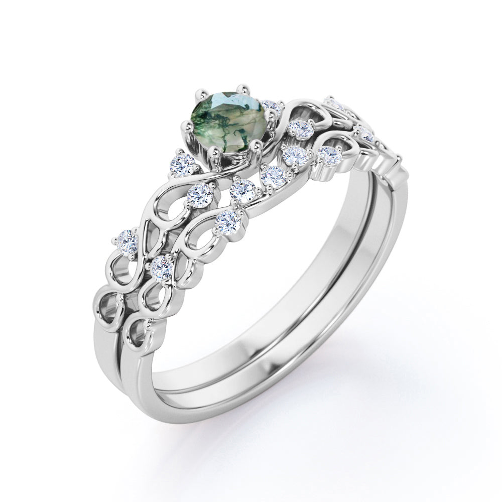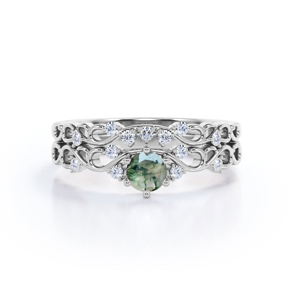 Dendritic 0.6 carat Round Moss Agate Crystal and Moissanite Swirly Wedding Ring Set in White Gold