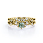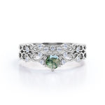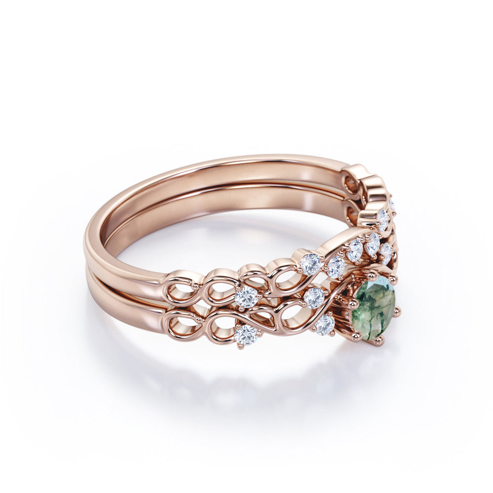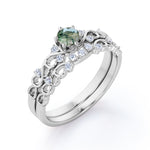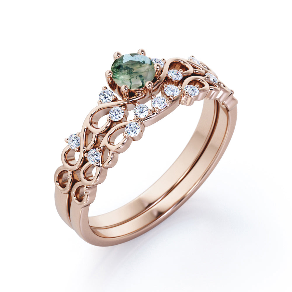 If you are looking for a gift for your beloved one, either it's your family, lover or friend, this affordable ring will be a special unique gift for them. Green moss agate stone is embedded by green minerals, illustrating green lichen/moss inclusion inside the gemstone which makes every green moss agate looks different. 0.5 carat round green agate is placed on a vine-inspired engagement ring where the band is crafted in to scroll pattern and decorated by round Moissanite. Wedding band features the same design and also has dainty Moissanite scatter around the band. They can be worn together or separately but either way, it will give you a different beautiful look. The ring set is available in the color of white gold, rose gold, yellow gold or black gold with the metal option of 18k gold over silver, 10k gold and 14k gold.