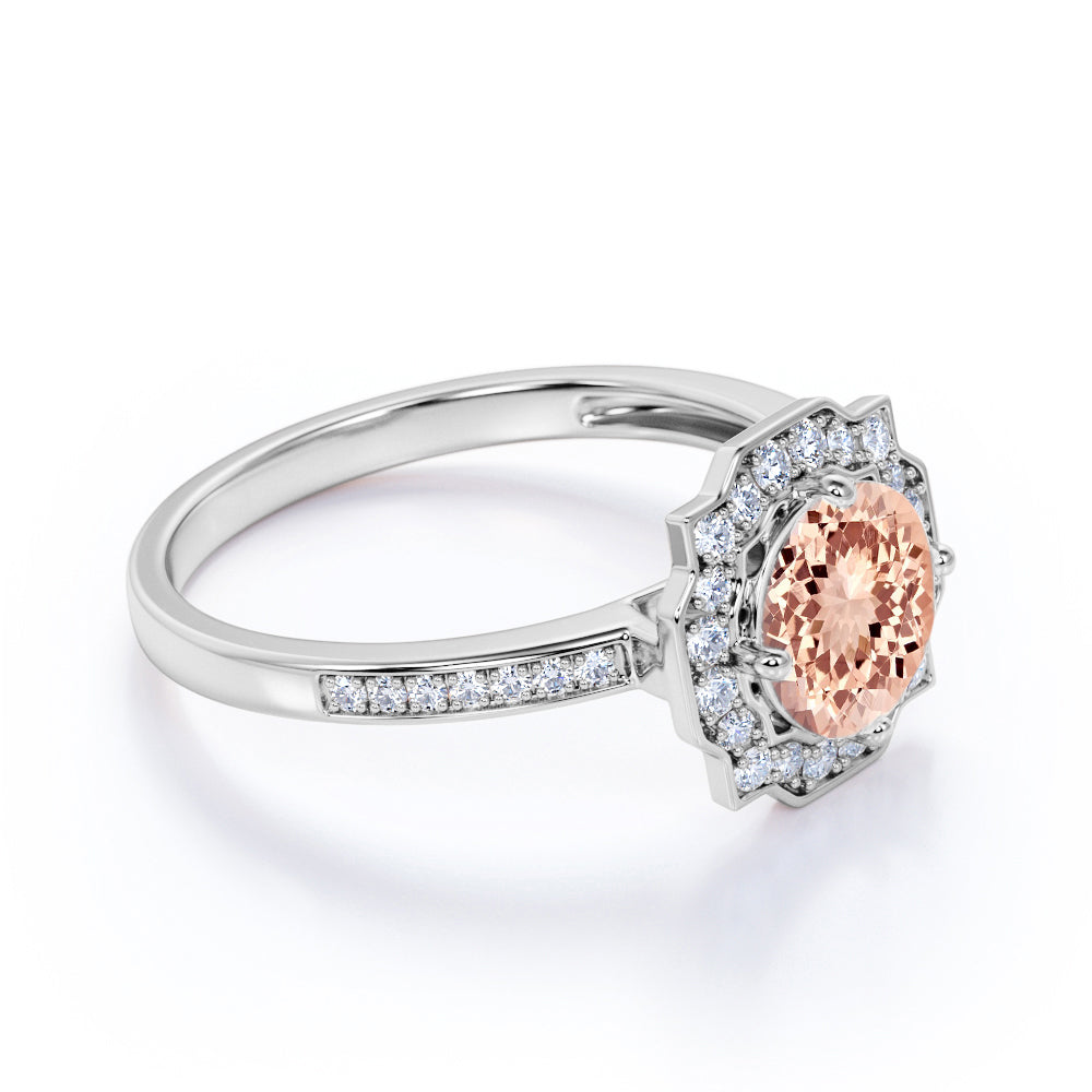 This is a very beautiful handmade art deco style Morganite and Diamond Engagement Ring for women. The ring is made with real peach pink morganite, real diamonds and on real gold. The handcrafted engagement ring features 1 carat round cut peach pink morganite in the center, surrounded with 0.25 carat of diamonds, for a total carat weight of 1.25 Carats.