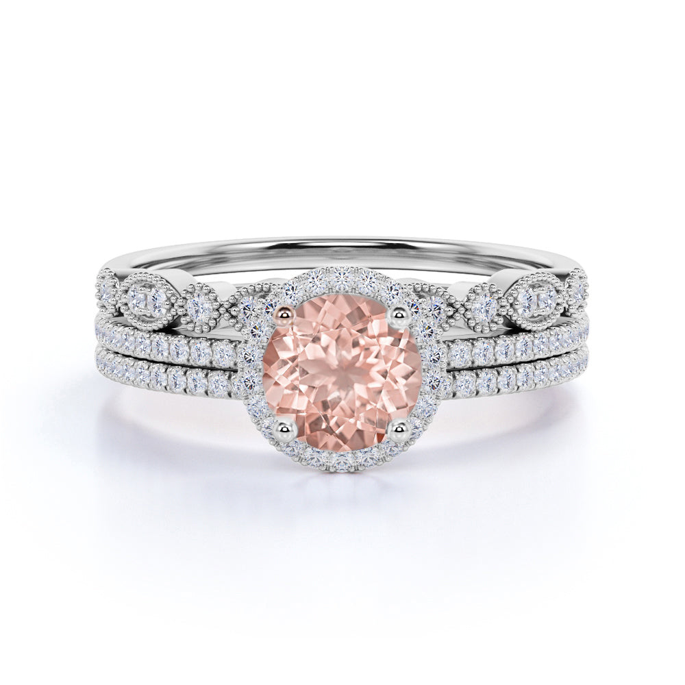 Designer 2 Carat Round Cut Peach Morganite and Diamond Trio Wedding Ring Set in 10k White Gold Celebrity Ring
