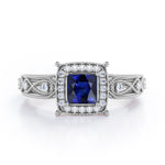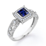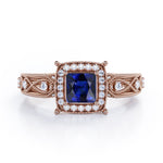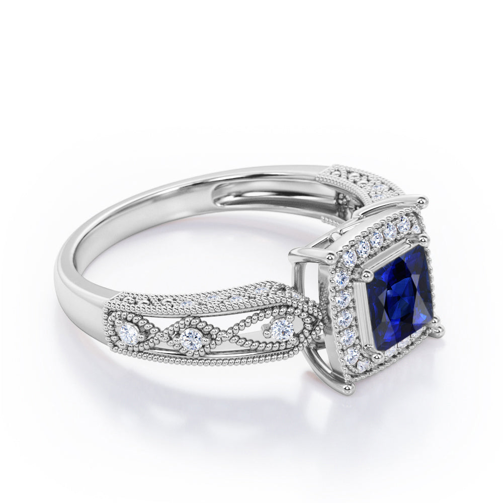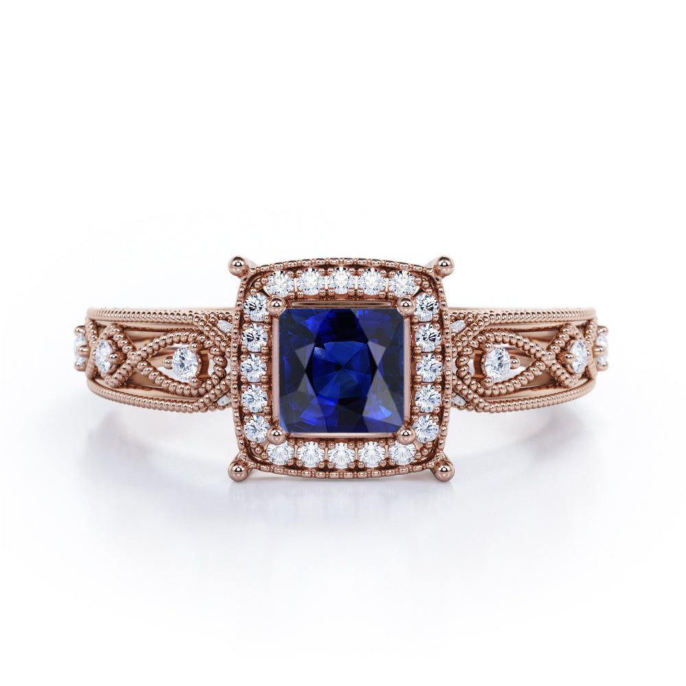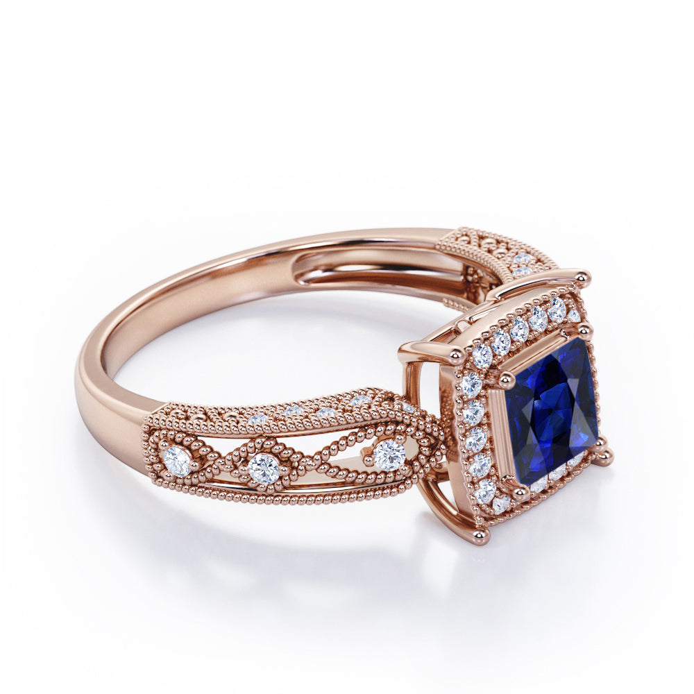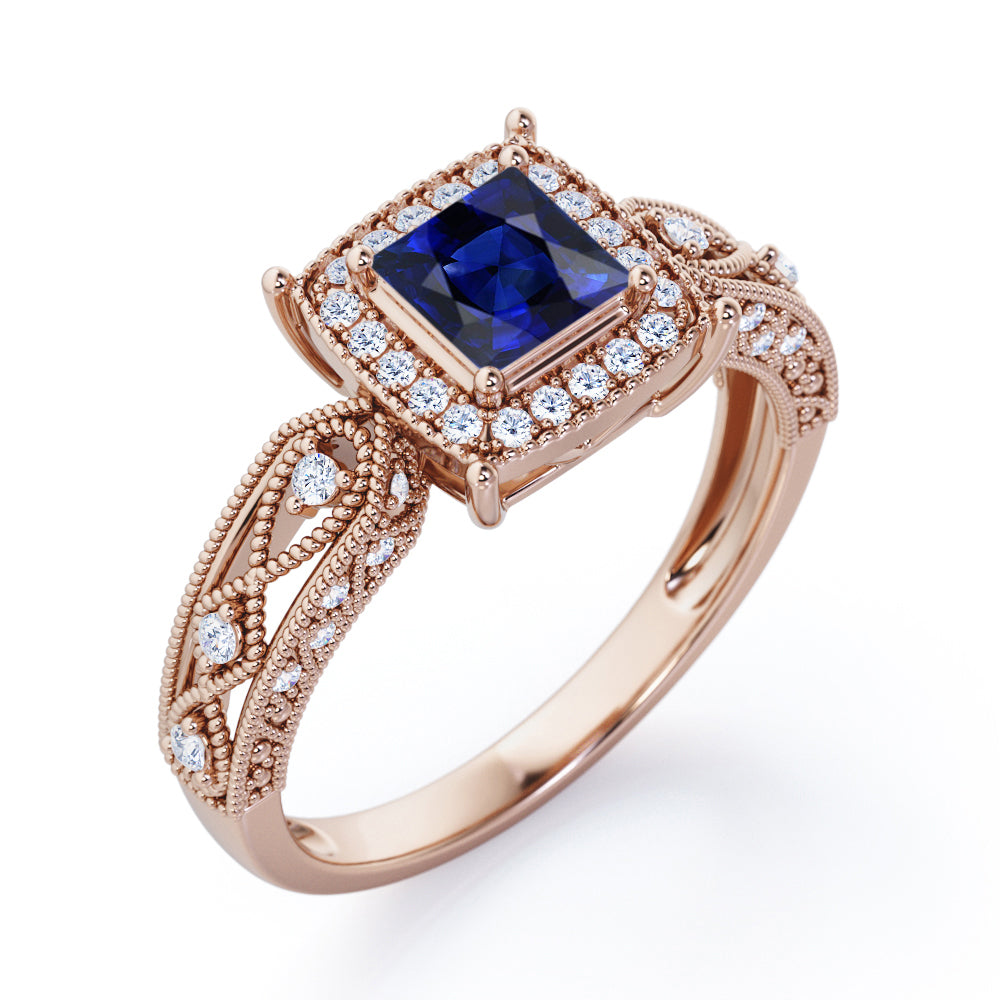 Designer Beaded 1.35 Carat Princess Cut Sapphire And Diamond Halo Engagement Ring In Rose Gold. Subtle yet striking, this majestic Sapphire and diamond engagement ring is impossibly romantic. Featuring shining 1 carat princess cut sapphire and 0.35 carat of sparkling white diamonds, in addition to a timeless pave set diamond band with subtle quilted detailing with intricate milgrain edges, there is simply so much to love in this exquisite piece. This exclusive halo engagement ring will definitely make you stand out in the crowd. With vintage sensibilities, this one-of-a-kind sapphire ring is handmade by our experienced craftsmen. This designer beaded 1.35 carat princess cut sapphire and diamond halo engagement ring in rose gold can also be customized to 18k Gold plating over silver, 10k Gold or 14k Gold as per your preference. Please note that if the ring is made over silver, the side stone will be moissanite and if it is made on gold, diamond will be employed as the side stone.