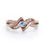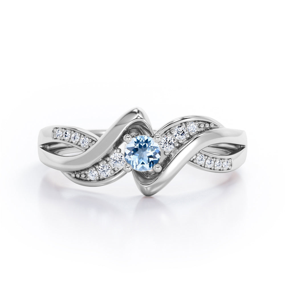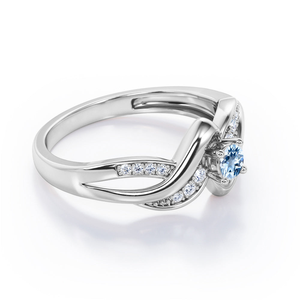 Distorted Unique Twisted Rope 0.6 carat Round Aquamarine and Moissanites Promise Ring in White Gold