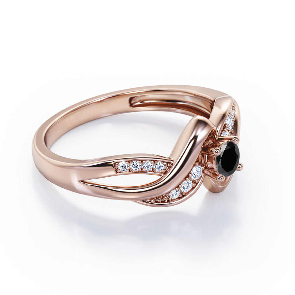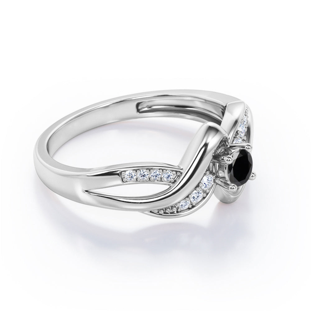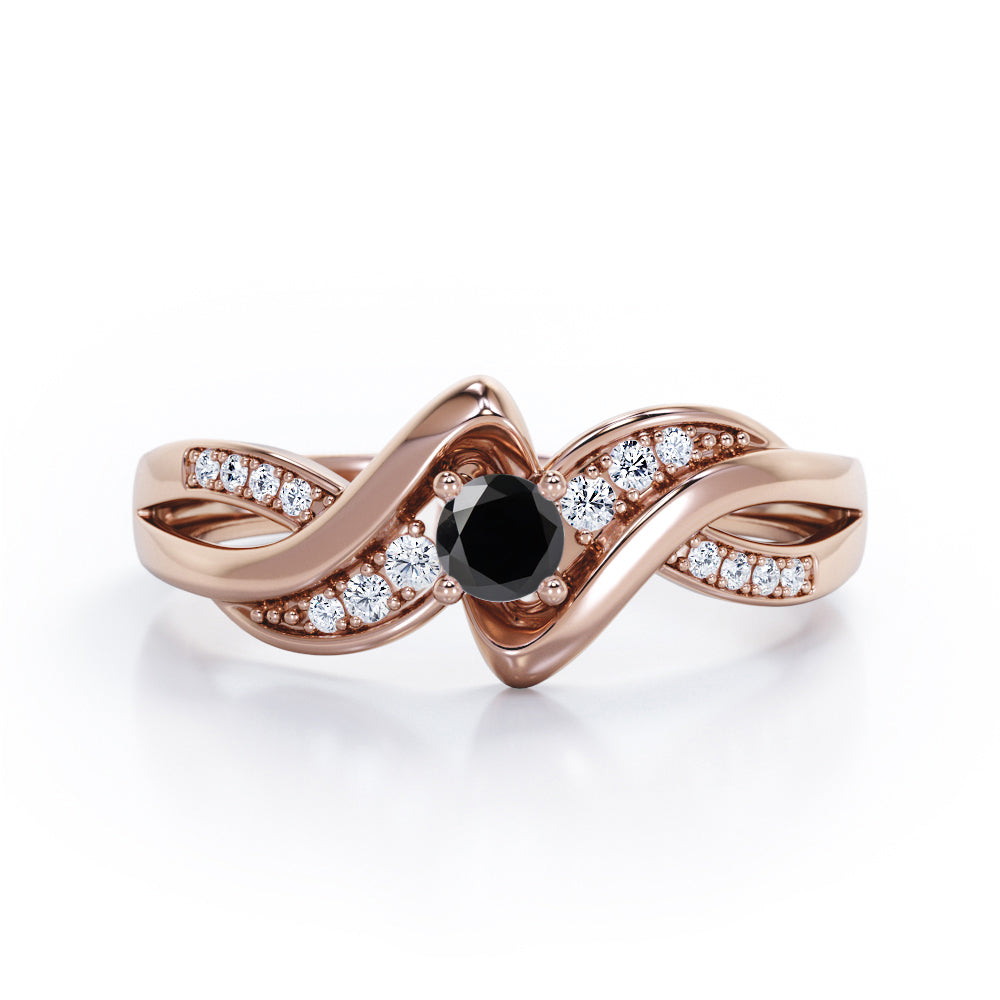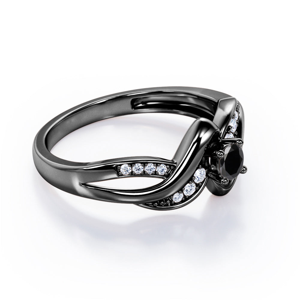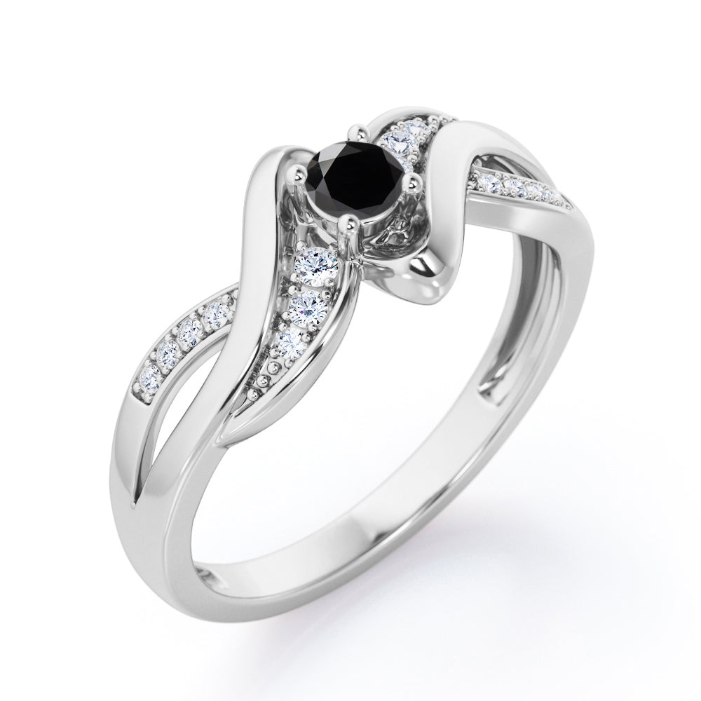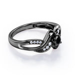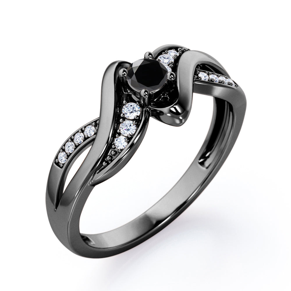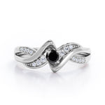 Embellish her hands with a Distorted Unique Twisted Rope 0.6 carat Round Black diamonds Promise Ring in White Gold. The ring may not have any intricate design but it is surely a jewelry piece that should be treasured. A 0.5 carat Round Black diamond is locked in four prongs with the shank swirling and twisted around the base. Three dwindled round petite Moissanite are placed on each side of the curved band which a center stone join them together like a flowing water in the river. The band is crossed and garnished with glistening round Moissanite, adding sparkles to the ring. The infinity engagement ring can be customized in to 18k gold over silver, 10k gold and 14k gold with the colors of white gold, rose gold, yellow gold and black gold.