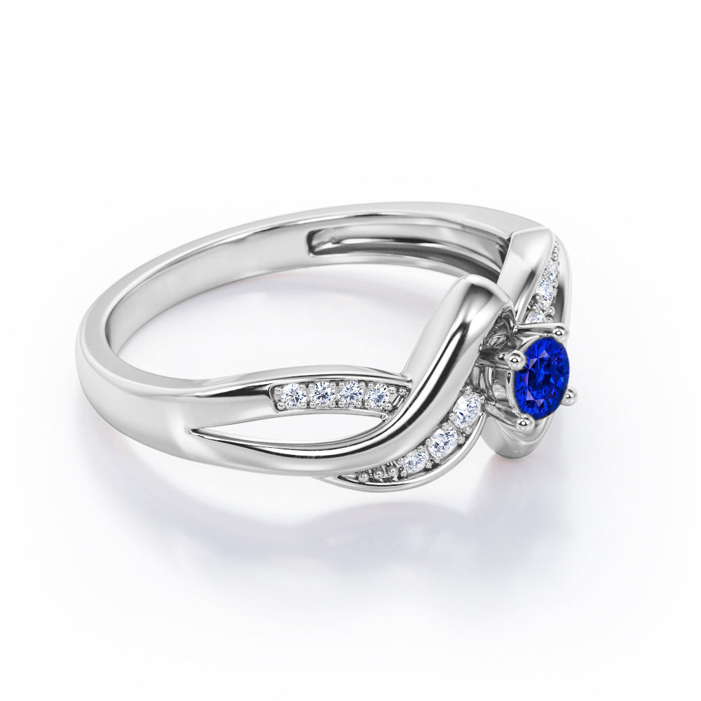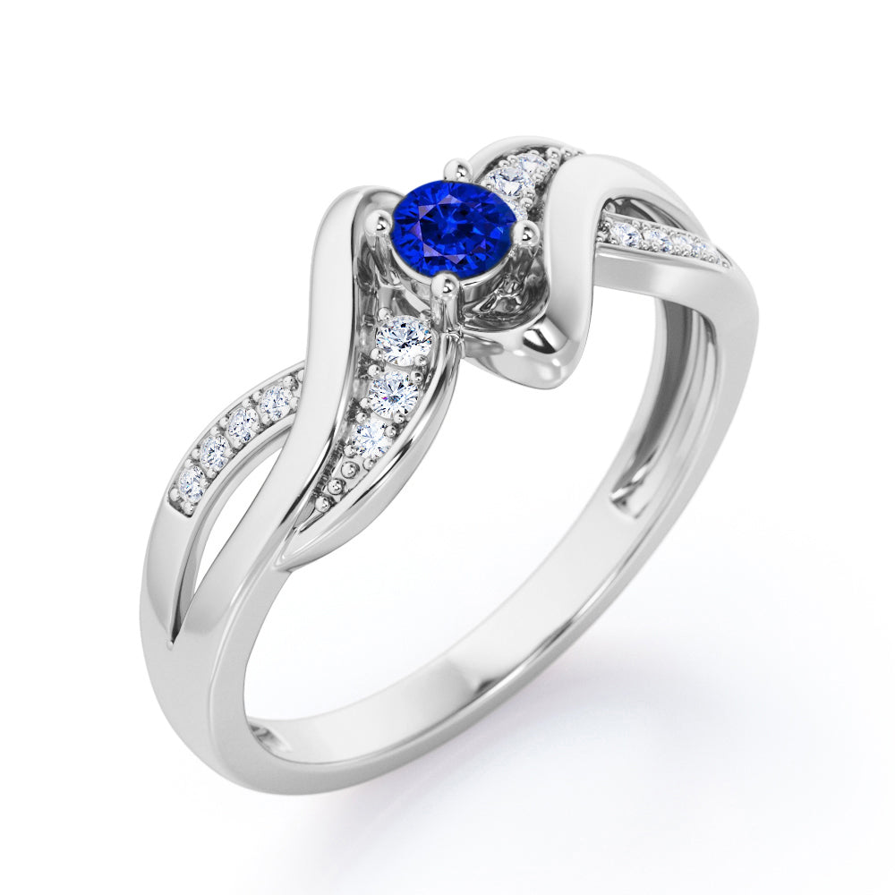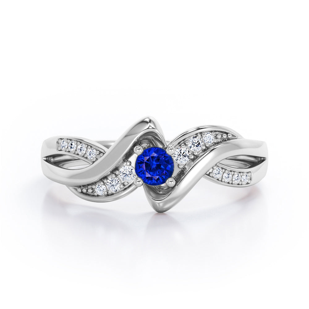 Distorted Unique Twisted Rope 0.6 carat Round Blue Sapphire and Moissanites Promise Ring in White Gold
